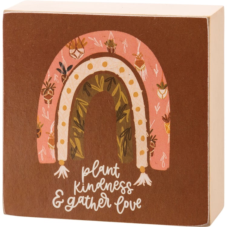 A wooden block sign from our Bohemian Collection featuring "Plant Kindness & Gather Love" sentiment and plant rainbow design. Our Gather Love sign is easy to hang via predrilled keyhole slot or can free-stand alone. Sides feature coordinating color for added interest.