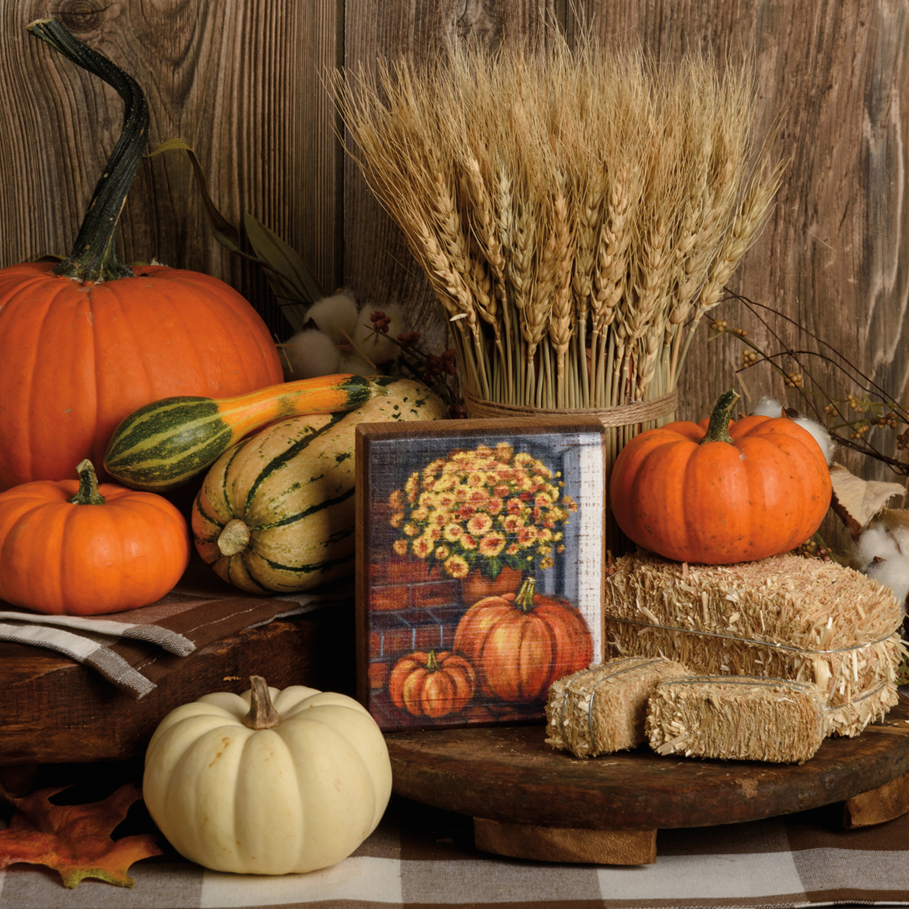 A wooden block sign depicting a fall display of mums and pumpkins. Design is replicated from original artwork painted onto burlap canvas, giving the art a unique depth and texture. Easy to hang via predrilled keyhole slot or can free-stand alone.