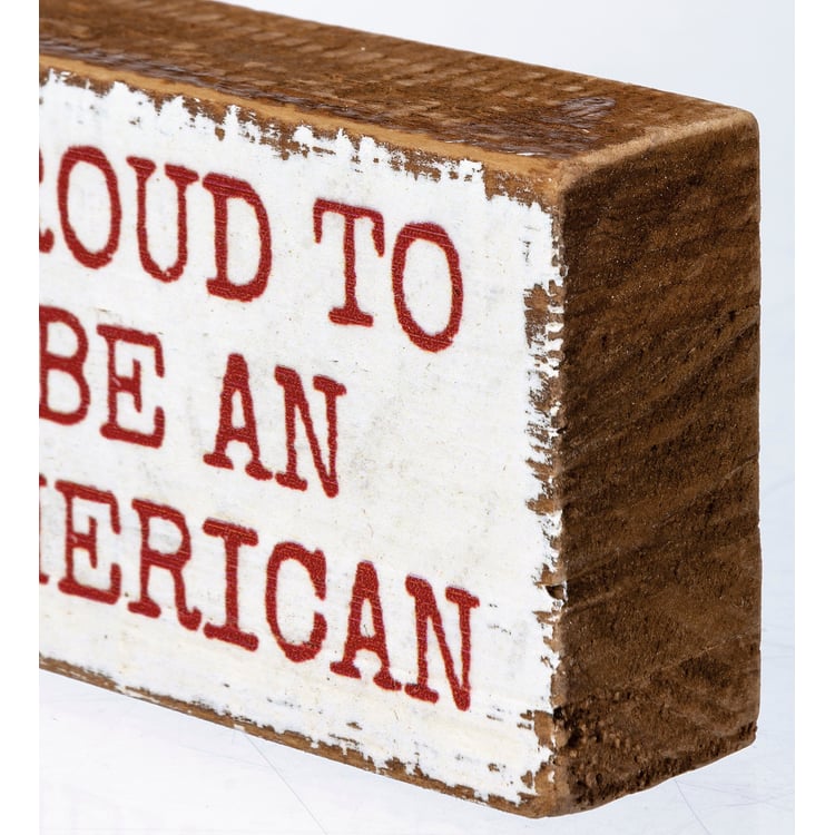 A wooden block sign from our Patriotic Collection featuring a "Proud To Be An American" sentiment. Design is replicated from original artwork painted onto burlap canvas, giving the art a unique depth and texture. Our Proud To Be An American sign is easy to hang via predrilled keyhole slot or can free-stand alone.