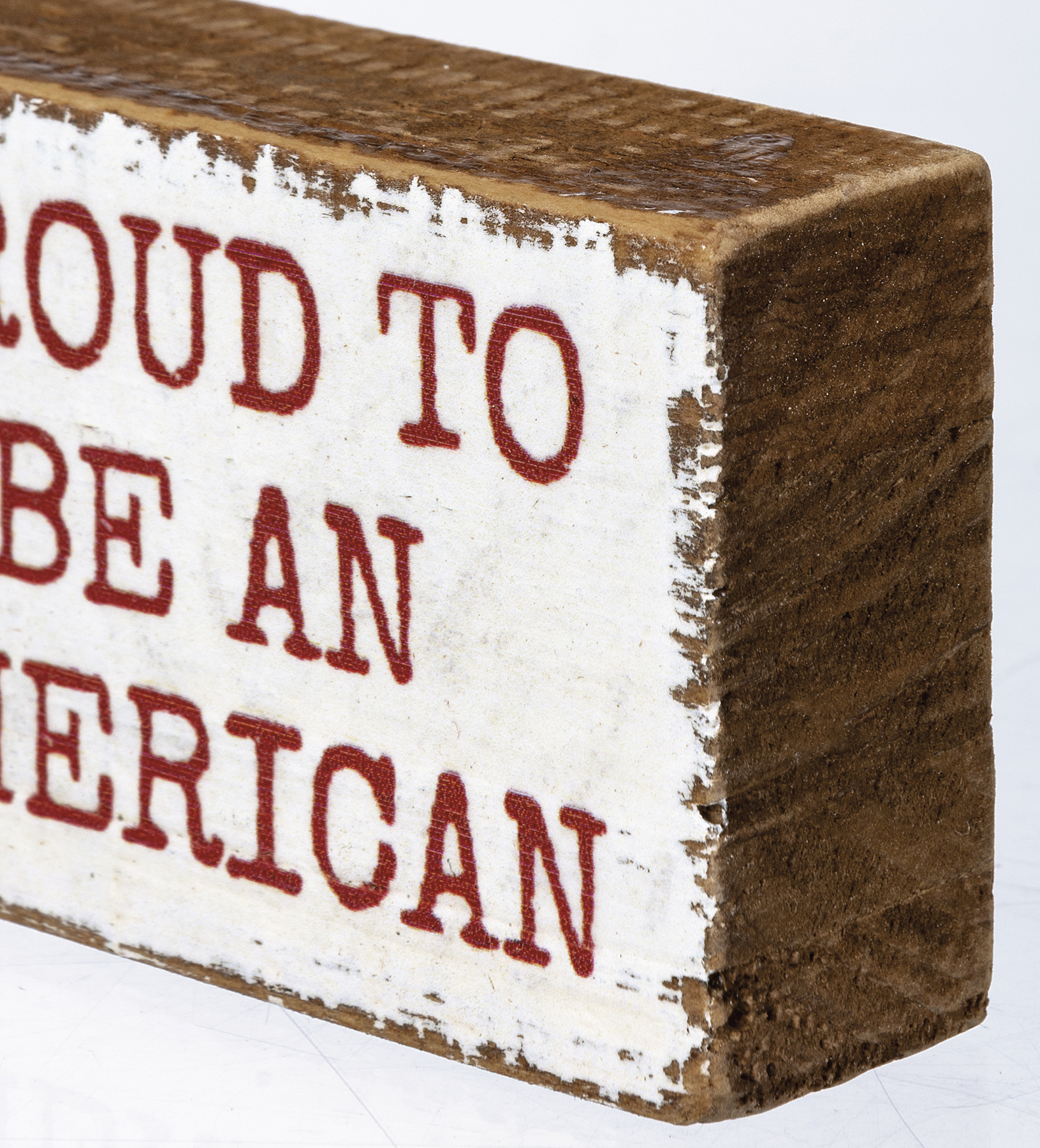 A wooden block sign from our Patriotic Collection featuring a "Proud To Be An American" sentiment. Design is replicated from original artwork painted onto burlap canvas, giving the art a unique depth and texture. Our Proud To Be An American sign is easy to hang via predrilled keyhole slot or can free-stand alone.