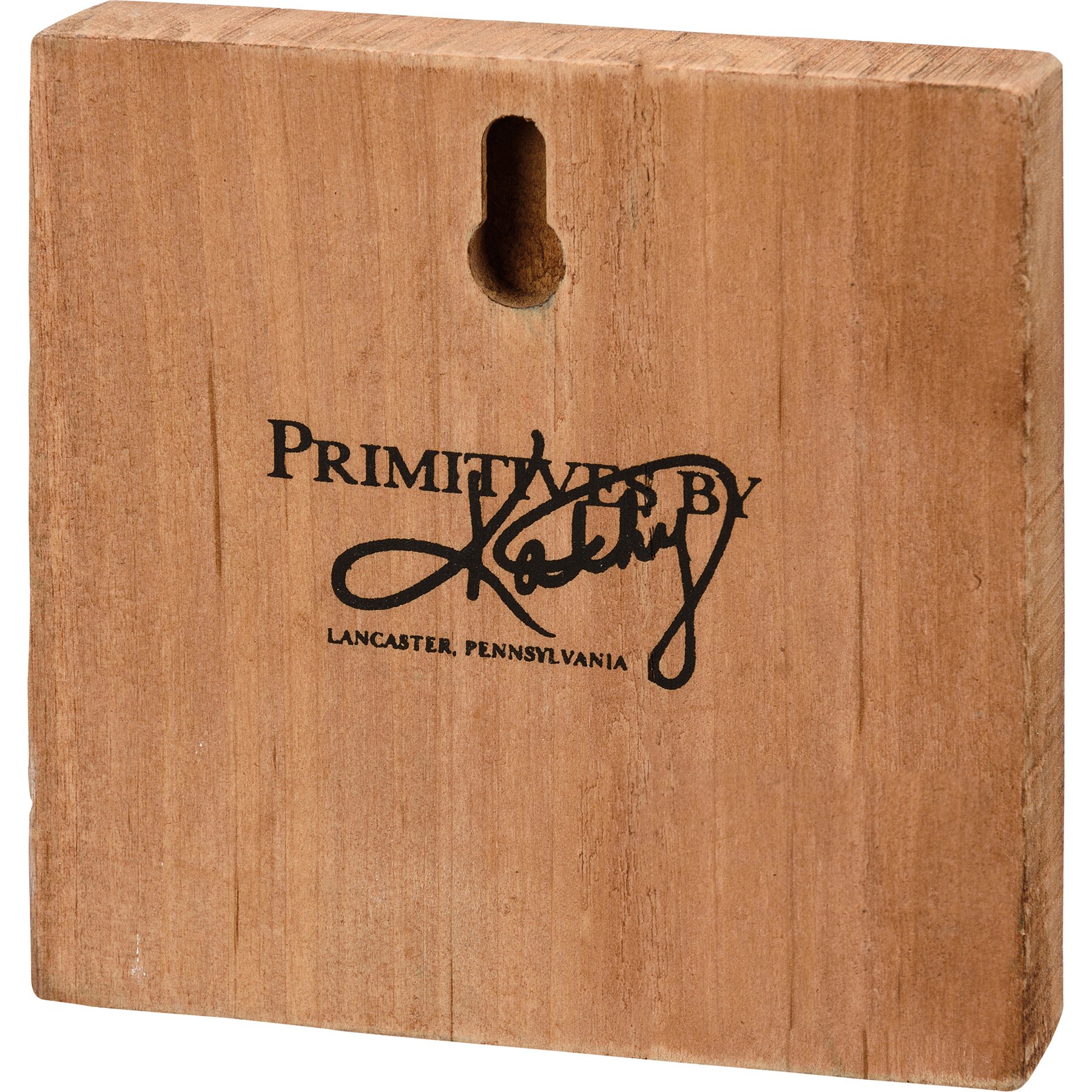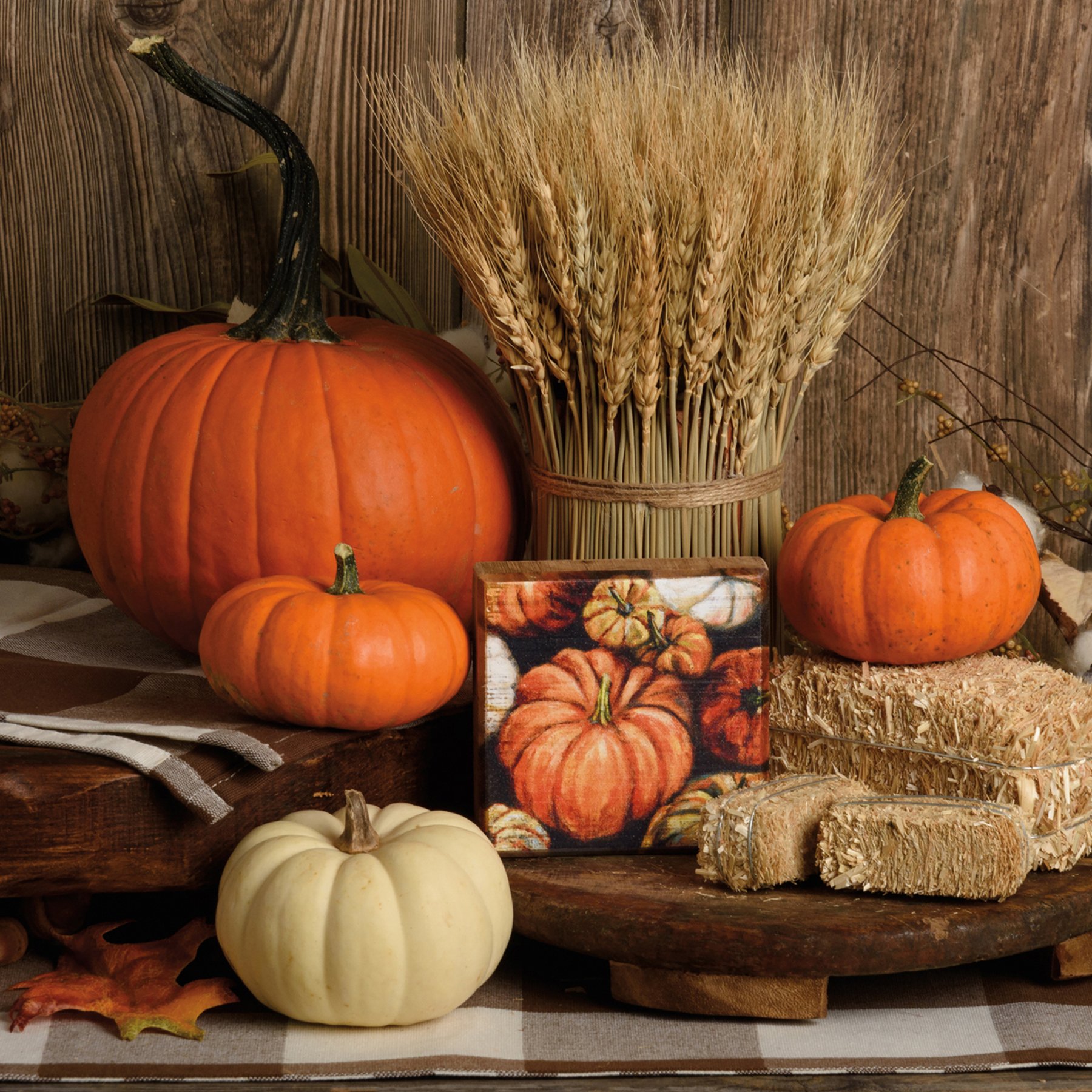 A wooden block sign depicting a close-up of a bunch of pumpkins. Design is replicated from original artwork painted onto burlap canvas, giving the art a unique depth and texture. Easy to hang via predrilled keyhole slot or can free-stand alone.