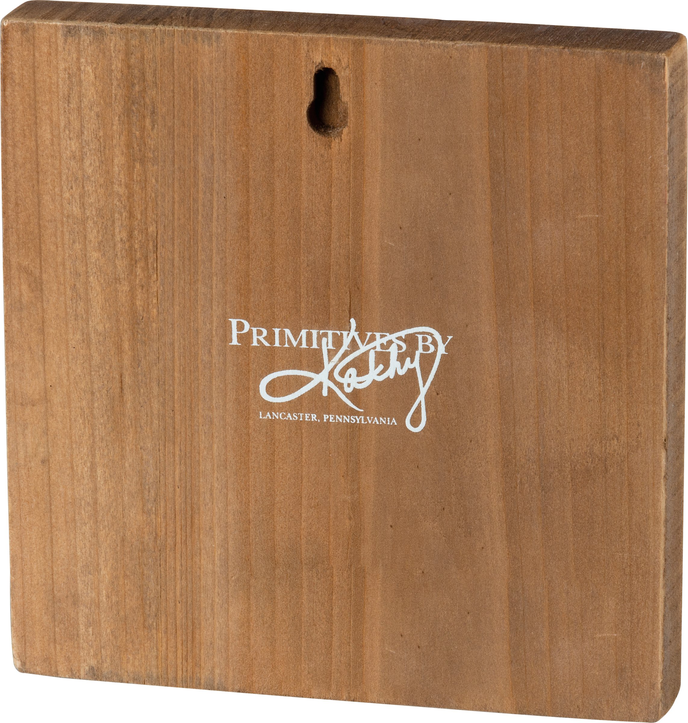 A wooden block sign featuring a bunny in a field and dandelion details. Design is replicated from original artwork painted onto burlap canvas, giving the art a unique depth and texture. Hangs easily by predrilled back keyhole or can free-stand alone.