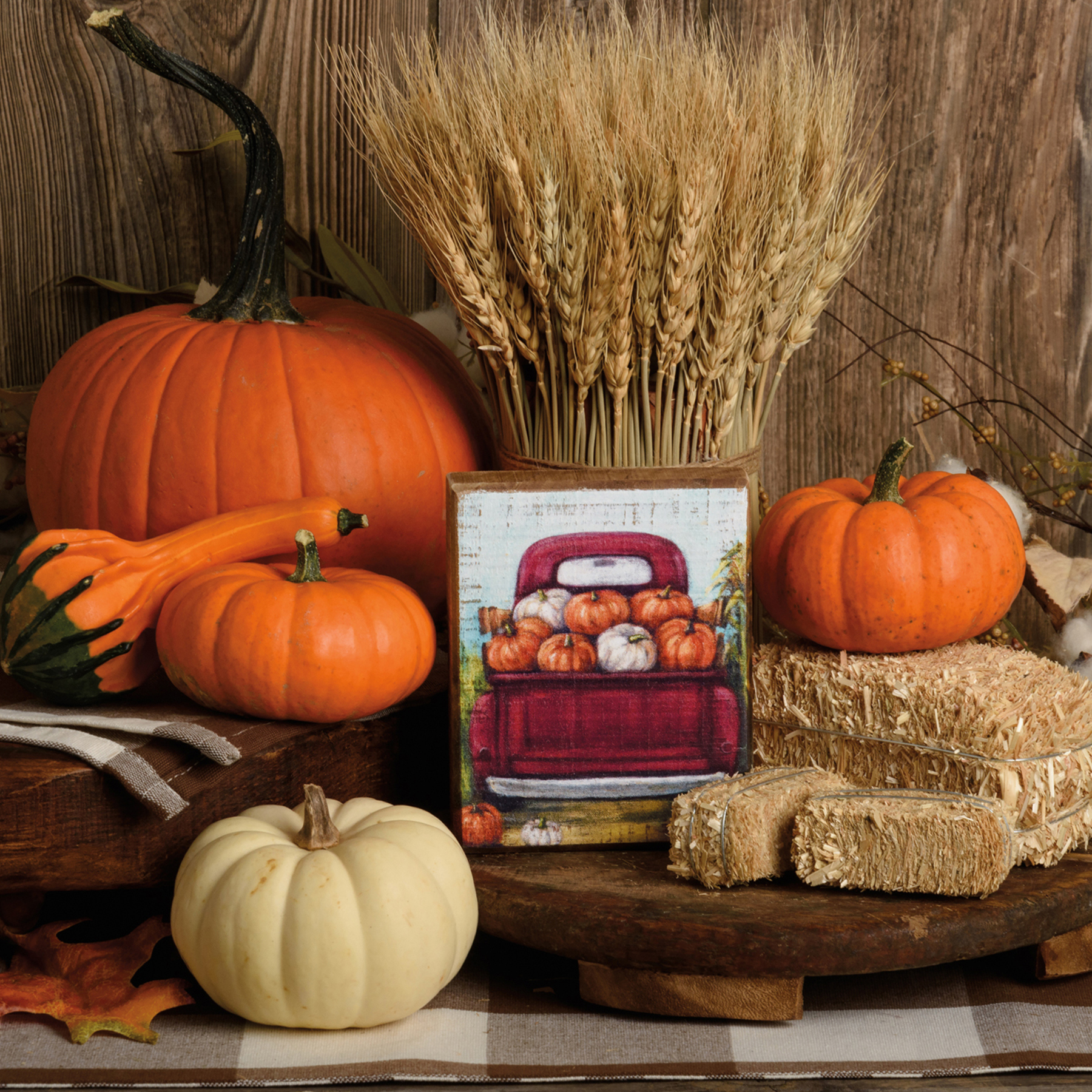 A wooden block sign depicting a red truck hauling a load of pumpkins. Design is replicated from original artwork painted onto burlap canvas, giving the art a unique depth and texture. Easy to hang via predrilled keyhole slot or can free-stand alone.