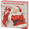A wooden block sign from our Christmas Collection displaying vintage art of Santa filling a red stocking while winking with glitter accents and fun "Santa's Favorite Ho!" sentiment. Sides and back feature coordinating red color. Our Santa's Favorite block sign is easy to hang via predrilled keyhole slot or can free-stand alone. A jolly seasonal home accent with a variety of display options.
