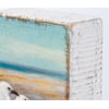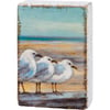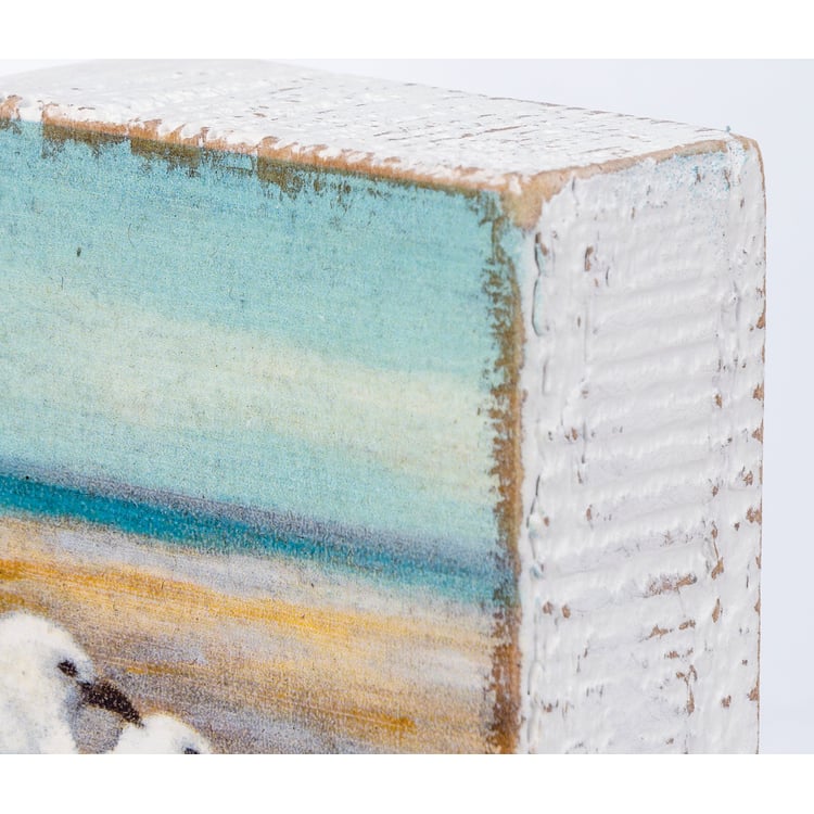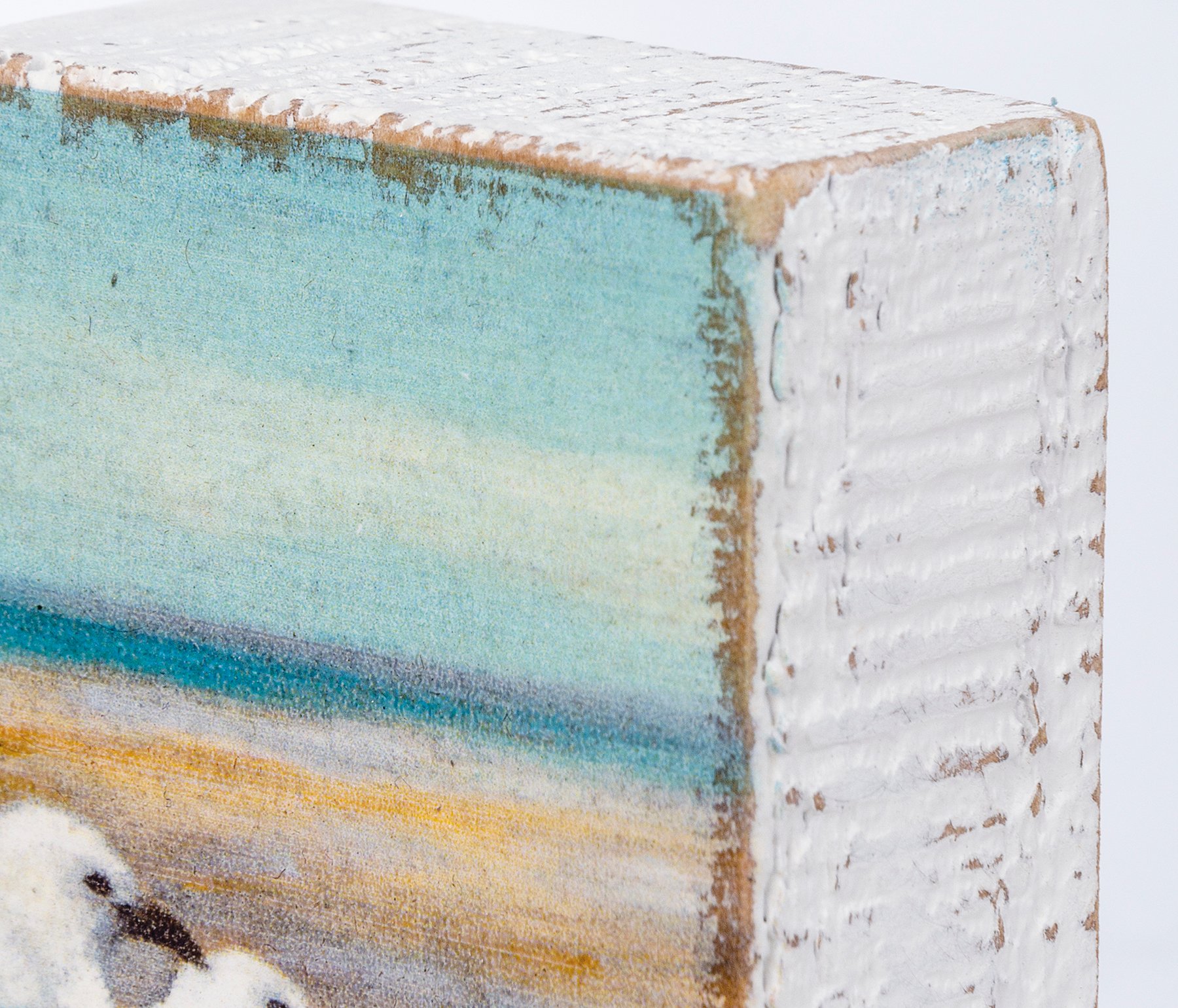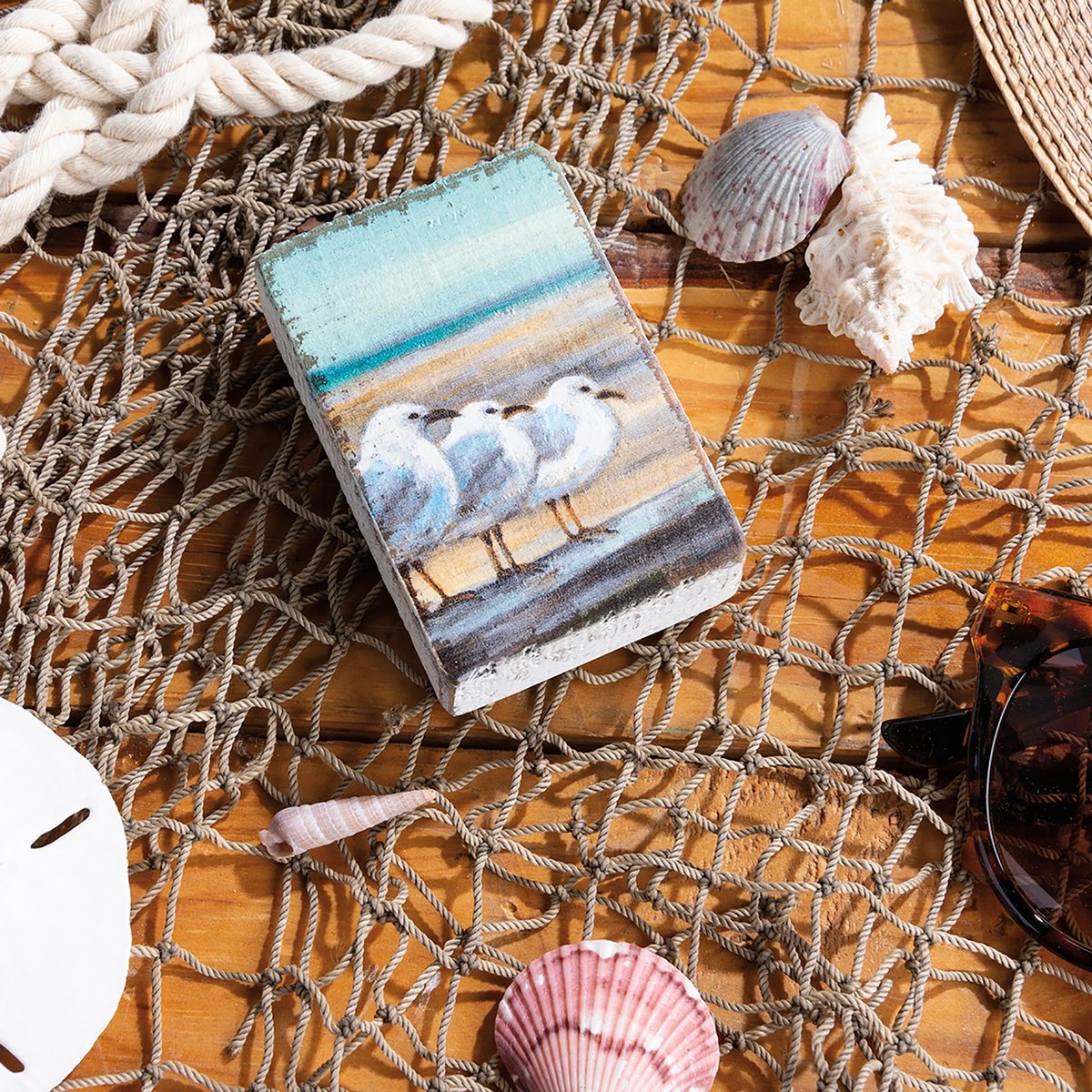 A wooden block sign depicting seagulls on the beach. Design is replicated from original artwork painted onto burlap canvas, giving the art a unique depth and texture. Easy to hang via predrilled keyhole slot or can free-stand alone.