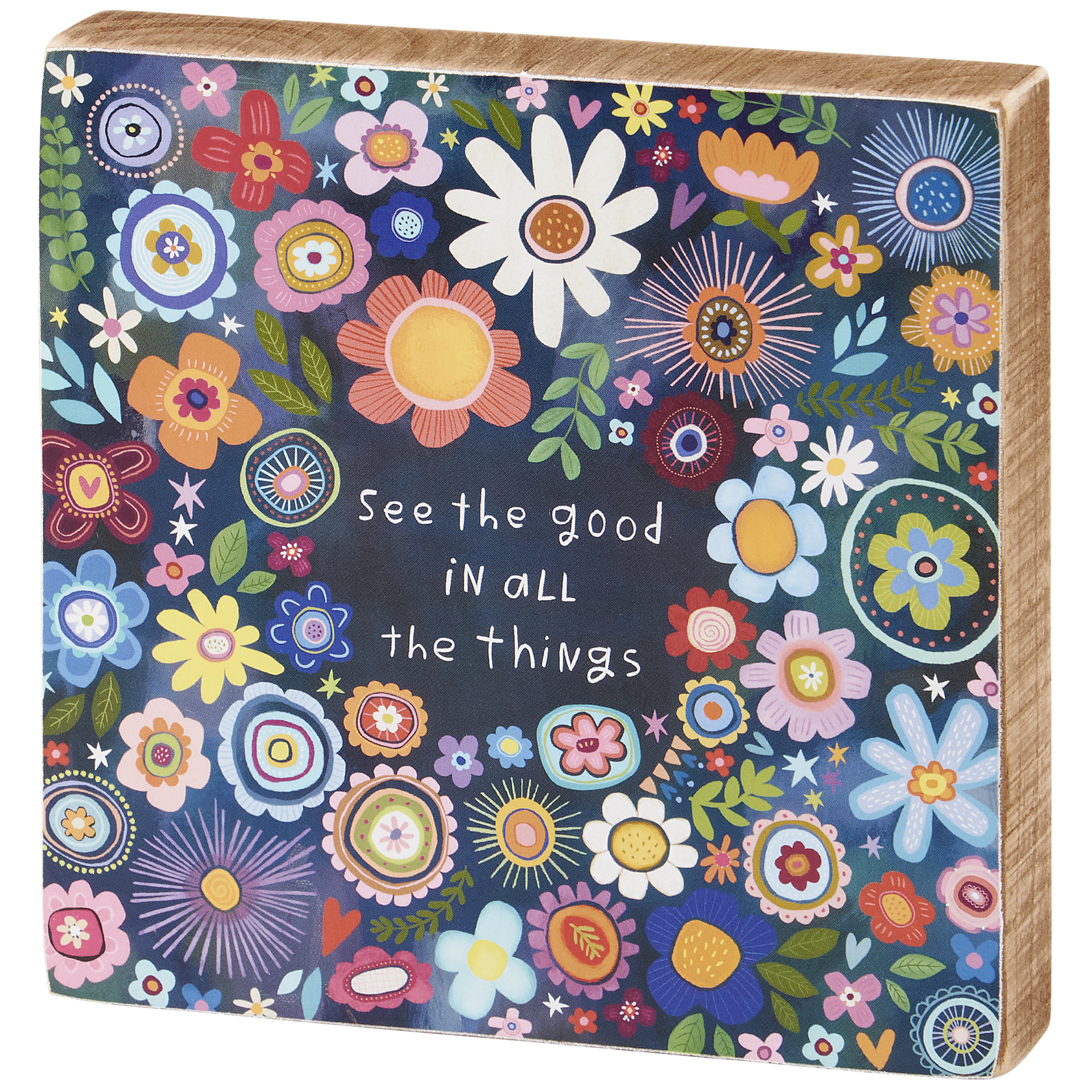A colorful wooden block sign from our Inspiration & Blooms Collection displaying hand illustrated abstract florals surrounding an inspirational sentiment that reads "See The Good In All Things." Block sign features coordinating natural wood on the sides and back. Our See The Good sign is easy to hang via predrilled keyhole slot or can free-stand alone. An inspirational everyday home accent great for gifting that can be easily displayed in any home or work space.