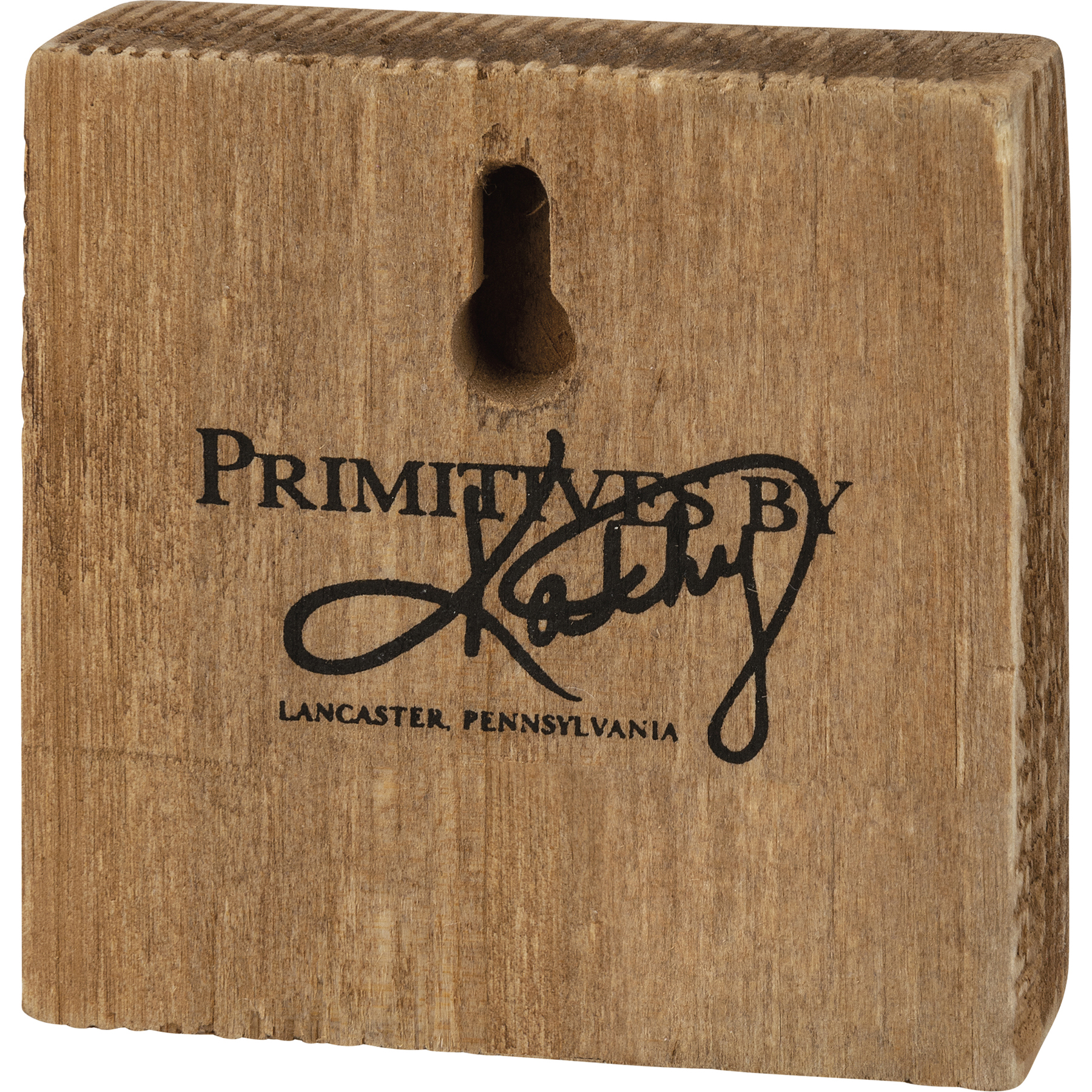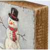 A wooden block sign featuring a snowman design. Design is replicated from original artwork painted onto burlap canvas, giving the art a unique depth and texture. Easy to hang via predrilled keyhole slot or can free-stand alone.