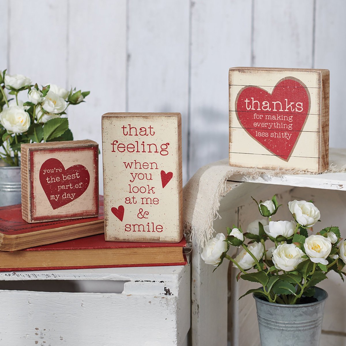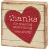 A charming wooden block sign from our Valentine's Day Collection displaying a rustic heart design with slat wood accents and "Thanks For Making Everything Less Shitty" sentiment. Sign features smooth wood sides for added interest. Our Thanks For Making block sign is easy to hang via predrilled keyhole slot or can free-stand alone.