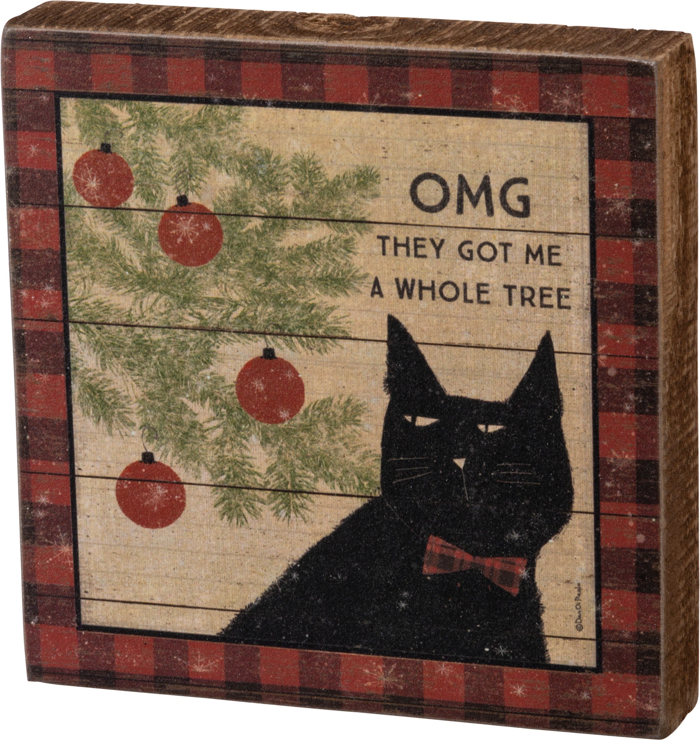 A wooden block sign from our Holiday Pet Collection displaying a rustic holiday design of a sassy cat staring at Christmas ornaments with a fun pet inspired sentiment that reads "OMG - They Got Me A Whole Tree.'" Seasonal cat block sign features distressed details with coordinating natural wood on the sides and back. Our Whole Tree block sign is easy to hang via predrilled keyhole slot or can free-stand alone. A fun pet-themed home accent perfect for gifting to cat lovers.