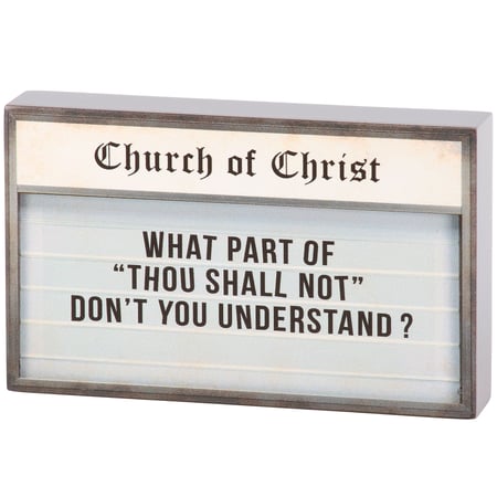 A wooden block sign from our Faith Collection displaying a church sign inspired design with a funny faith sentiment that reads "What Part Of 'Thou Shall Not' Don't You Understand?" Church sign features coordinating gray color on the sides and back. Our Thou Shall Not sign is easy to hang via predrilled keyhole slot or can free-stand on flat surface for display. A fun faith-themed home accent that can be easily displayed in any home or work space.