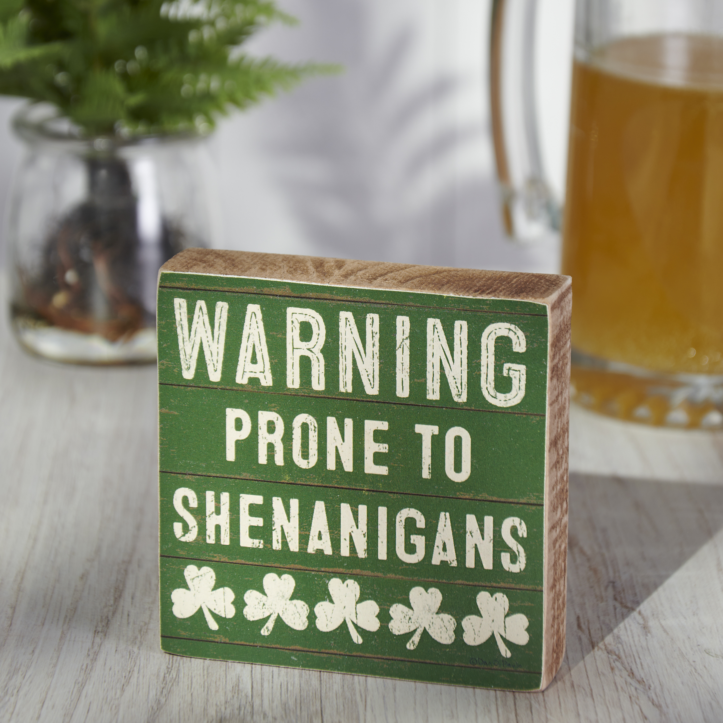 A wooden block sign from our St. Patrick's Day Collection displaying shamrocks and a humorous St. Patrick's Day themed sentiment that reads "Warning - Prone To Shenanigans." Design features rustic style with slat wood accents. Block sign features distressed details with coordinating natural wood on the sides and back. Our Prone To Shenanigans block sign is easy to hang via predrilled keyhole slot or can free-stand alone. A seasonal home accent with a variety of display options.