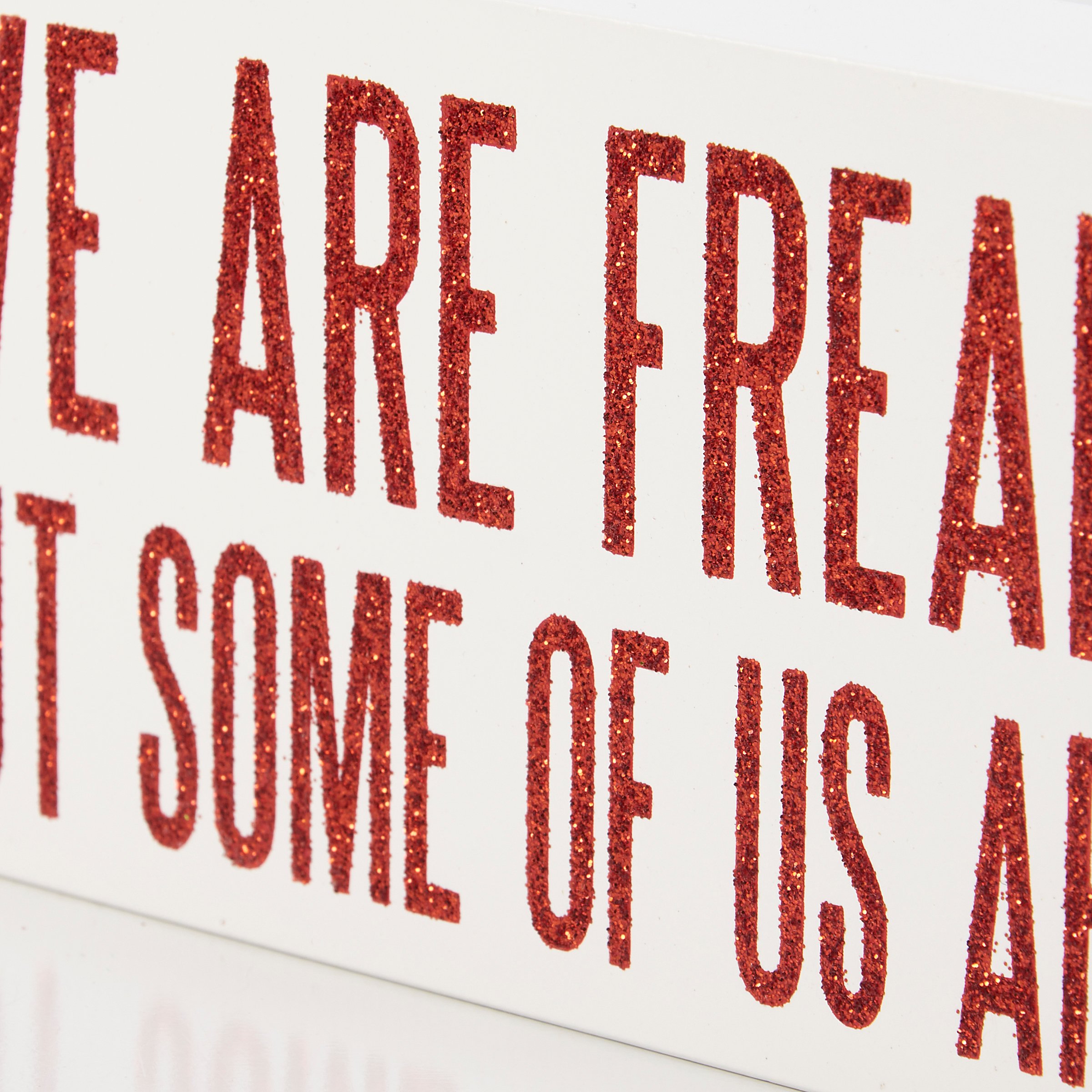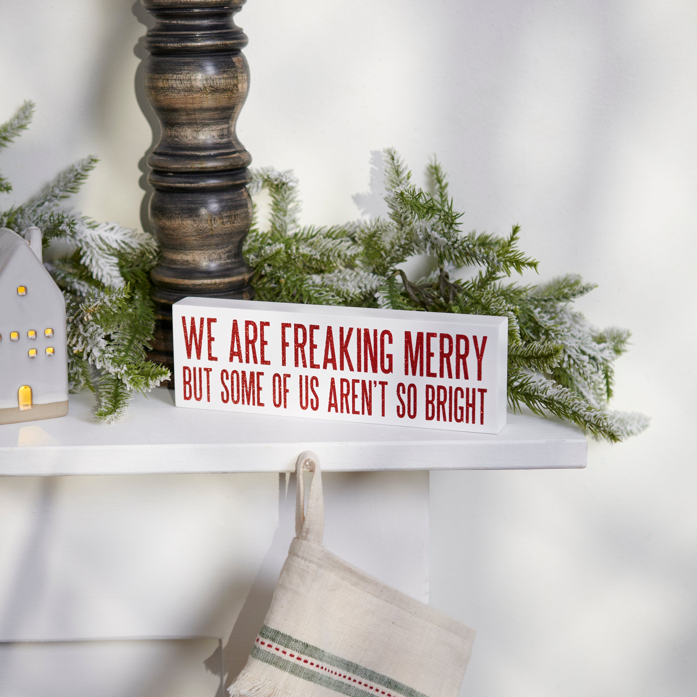 A wooden block sign from our Christmas Collection displaying a fun holiday sentiment that reads "We Are Freaking Merry But Some Of Us Aren't So Bright" with red glitter detail. Seasonal block sign features coordinating cream color on the sides and back. Our We Are Freaking Merry sign is easy to hang via predrilled keyhole slot or can free-stand alone. A fun seasonal home accent great for gifting that can be easily displayed in any home or work space.