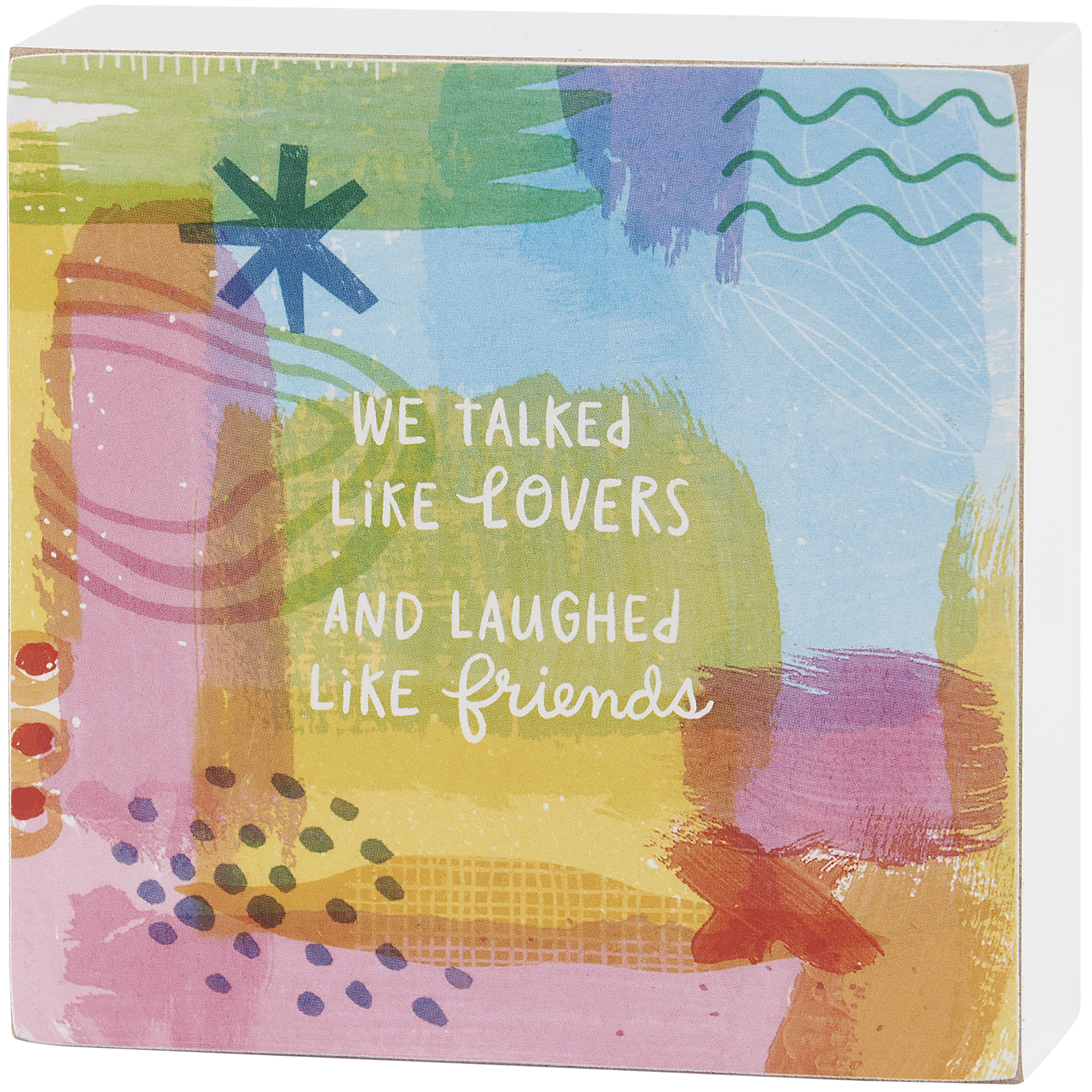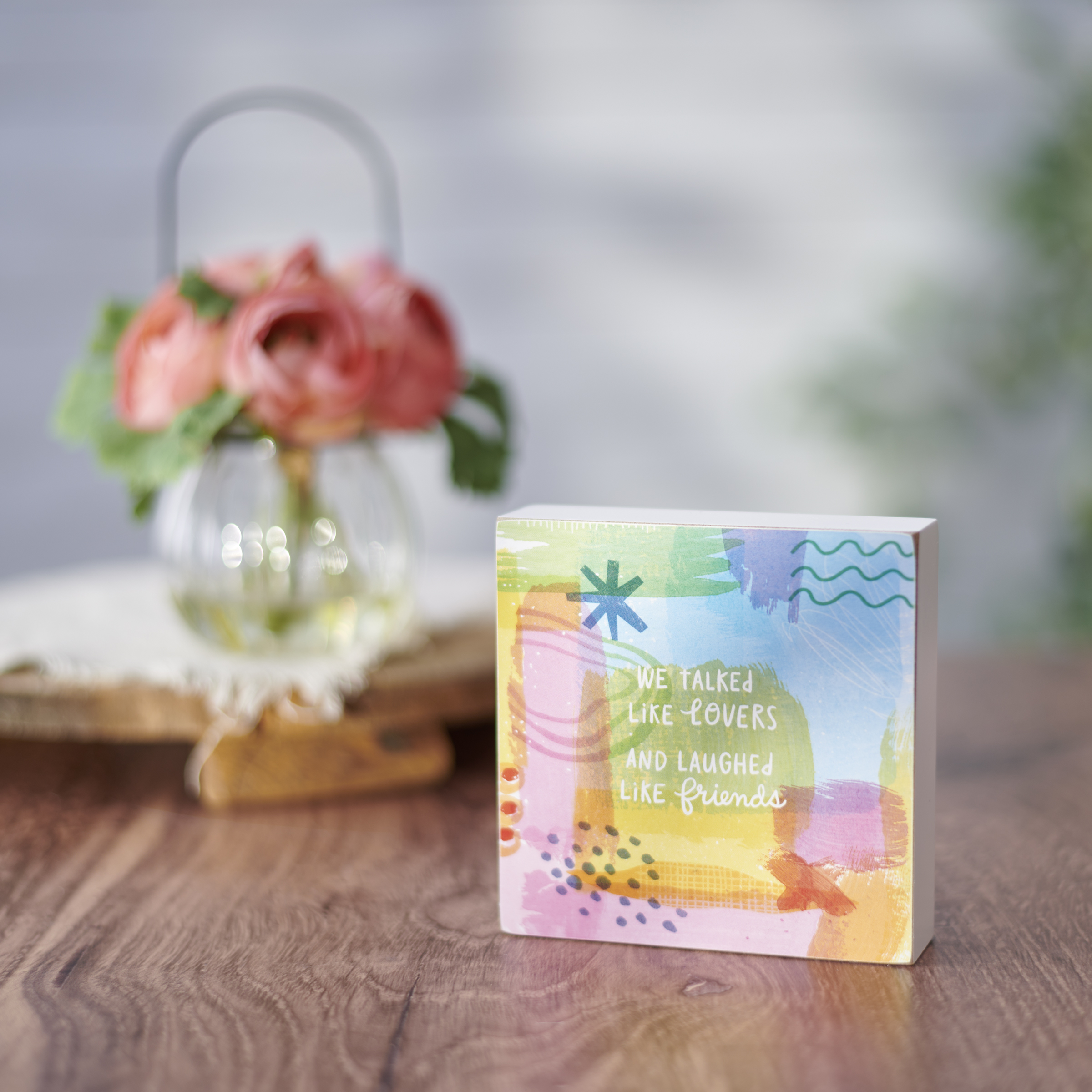 A wooden block sign from our Inspiration & Blooms Collection displaying a hand illustrated abstract design in a warm color palette behind a heartwarming sentiment that reads "We Talked Like Lovers And Laughed Like Friends." Block sign features coordinating white color on the sides and back. Our We Talked block sign is easy to hang via predrilled keyhole slot or can free-stand alone. A lovely gift perfect for an everyday home accent.