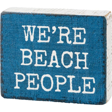 A wooden block sign featuring a "We're Beach People" sentiment in cream on an ocean blue background. Design is replicated from original artwork painted onto burlap canvas, giving the art a unique depth and texture. Distressed white sides make the design pop. Easy to hang via predrilled keyhole slot or can free-stand alone.