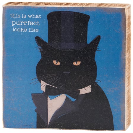 A wooden block sign from our Pet Collection displaying a rustic design of a sassy cat wearing a tuxedo and top hat with a fun pet inspired sentiment that reads "This Is What Purrfect Looks Like.'" Cat block sign features distressed details with coordinating natural wood on the sides and back. Our What Purrfect Looks Like block sign is easy to hang via predrilled keyhole slot or can free-stand alone. A fun pet-themed home accent perfect for gifting to cat lovers. Not eligible for discounting.
