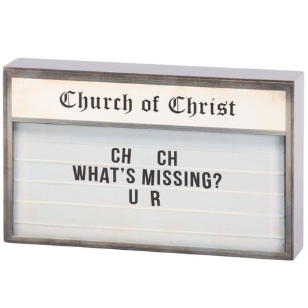 A wooden block sign from our Faith Collection displaying a church sign inspired design with a funny faith sentiment that reads "CH CH - What's Missing? U R." Church sign features coordinating gray color on the sides and back. Our What's Missing? sign is easy to hang via predrilled keyhole slot or can free-stand on flat surface for display. A fun faith-themed home accent that can be easily displayed in any home or work space.