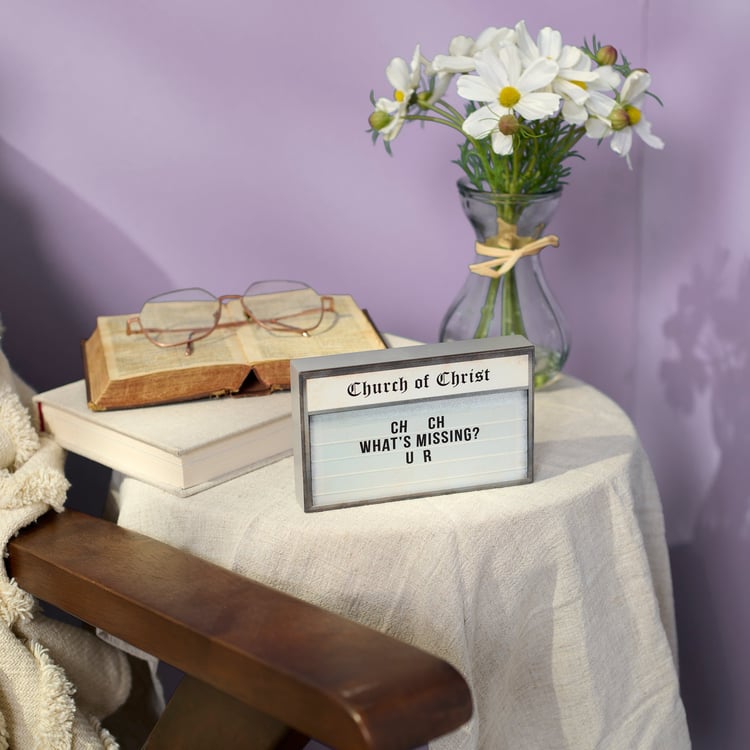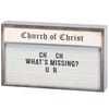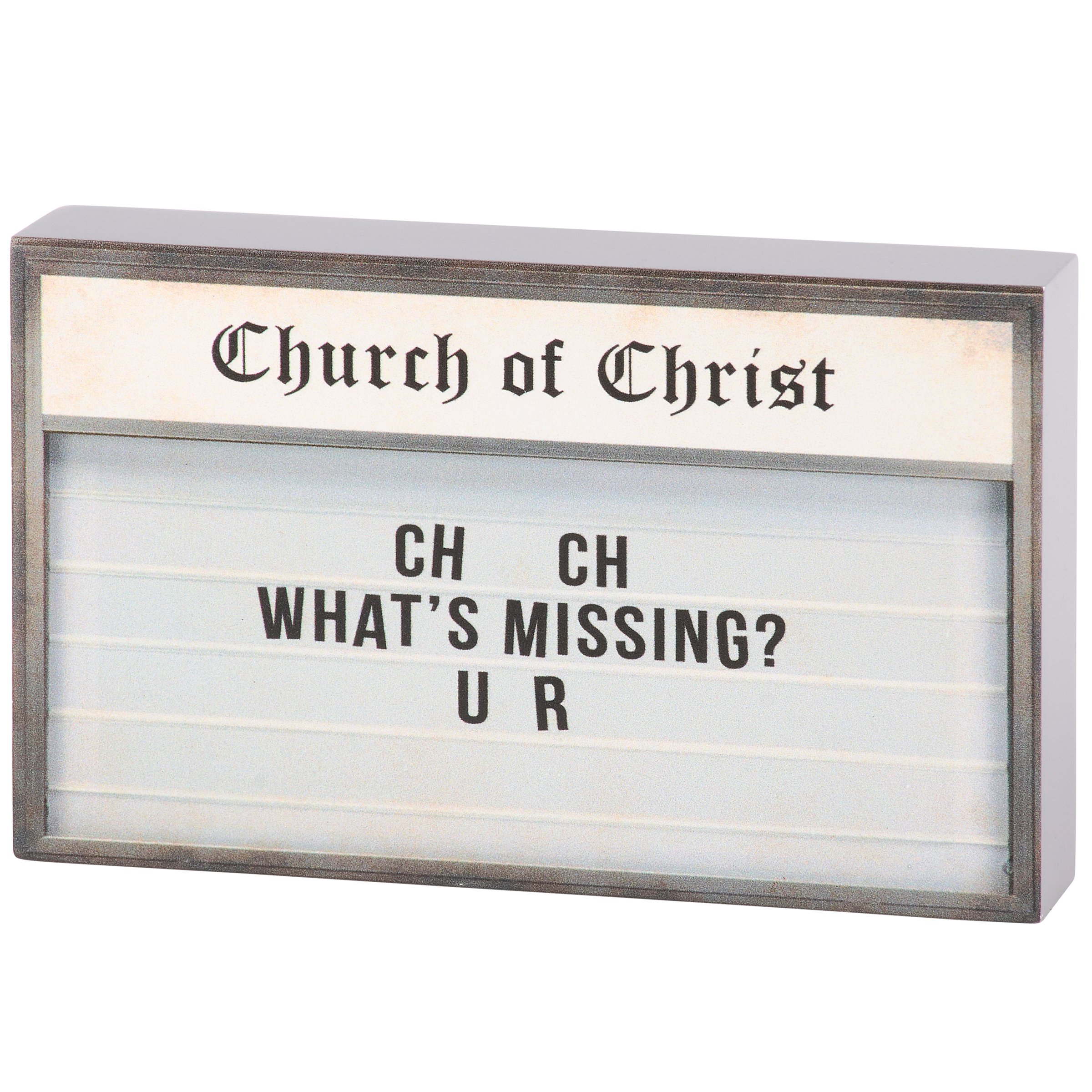 A wooden block sign from our Faith Collection displaying a church sign inspired design with a funny faith sentiment that reads "CH CH - What's Missing? U R." Church sign features coordinating gray color on the sides and back. Our What's Missing? sign is easy to hang via predrilled keyhole slot or can free-stand on flat surface for display. A fun faith-themed home accent that can be easily displayed in any home or work space.