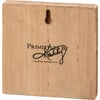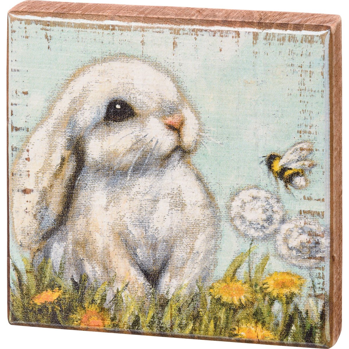 A wooden block sign from our Farmhouse Collection depicting a white bunny in a field. Design is replicated from original artwork painted onto burlap canvas, giving the art a unique depth and texture. Out white bunny sign is easy to hang via predrilled keyhole slot or can free-stand alone.