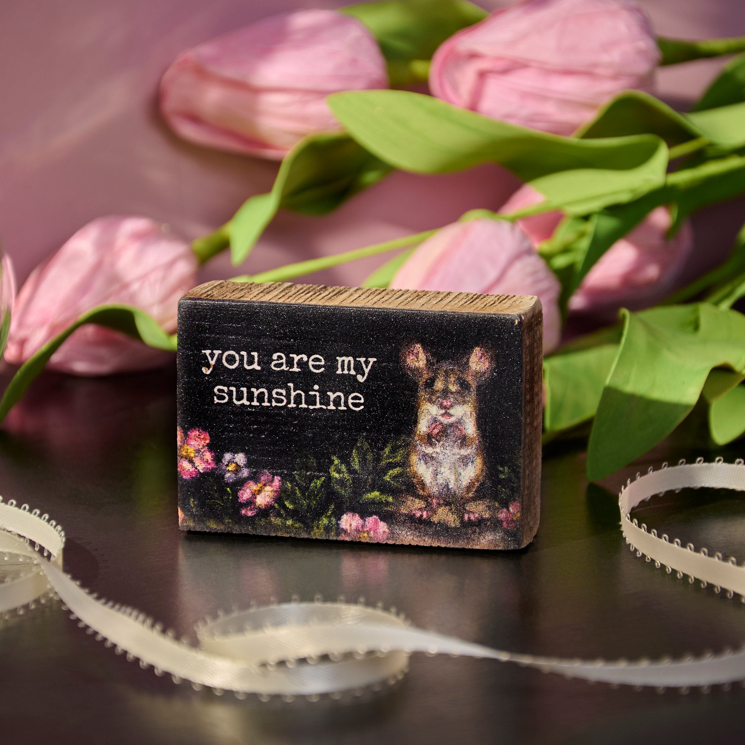 A small wooden block sign from our Easter & Spring Collection displaying a moody scene of a woodland mouse with spring flowers under an inspirational sentiment that reads "You Are My Sunshine." Spring mouse design is replicated from original artwork painted onto burlap canvas, giving the art a unique depth and texture. This spring block sign features distressed details with coordinating natural wood on the sides and back. Our My Sunshine Mouse sign is easy to hang via a predrilled keyhole slot on the back or can free-stand on a flat surface for display. A moody spring home accent that can be easily displayed in any home or work space.