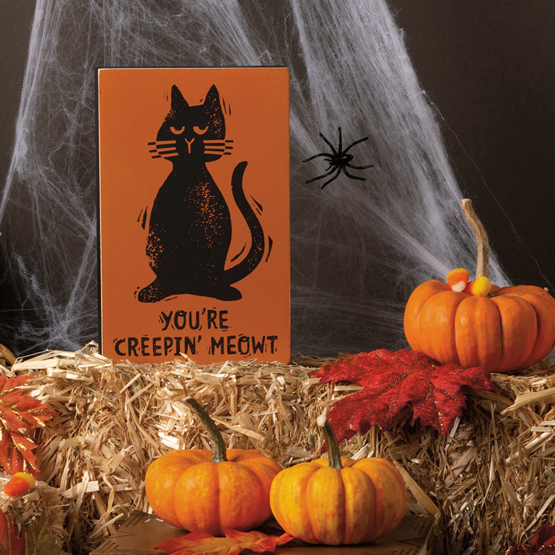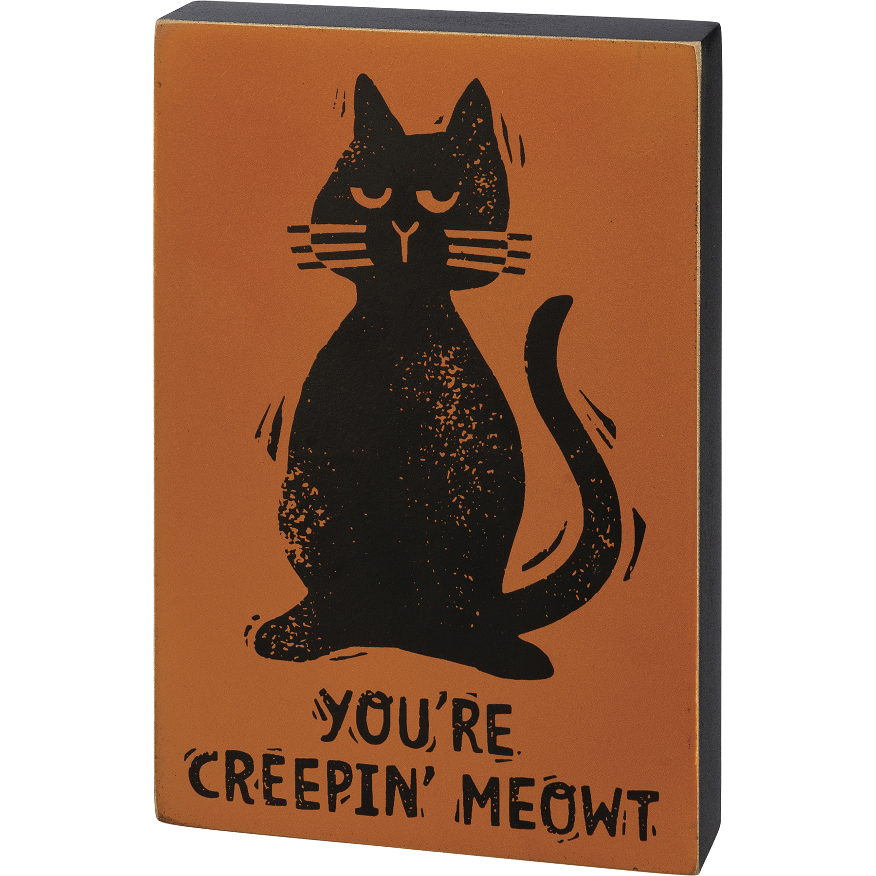 A wooden block sign featuring a block print "You're Creepin' Meowt" sentiment and cat design with classic Halloween color palette. Easy to hang via predrilled keyhole slot or can free-stand alone.