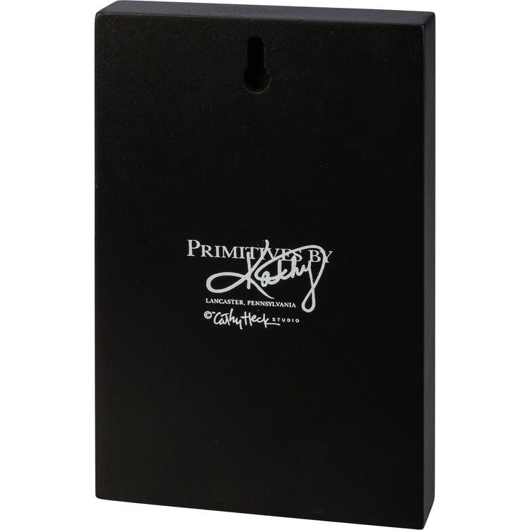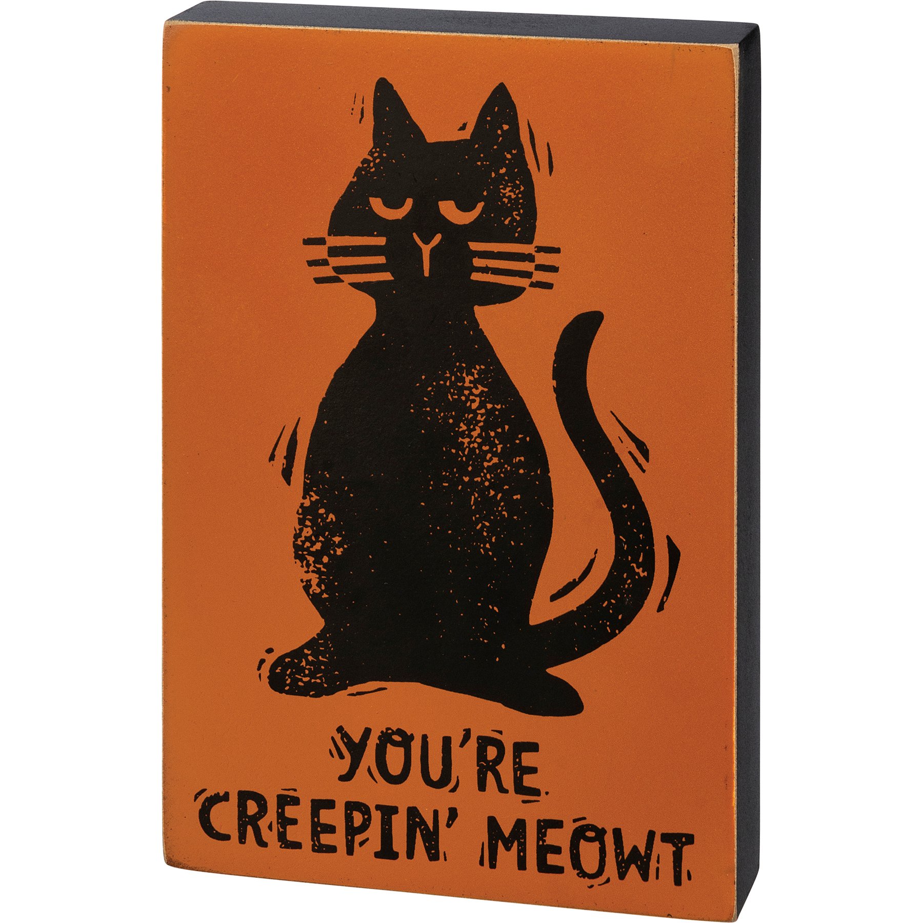 A wooden block sign featuring a block print "You're Creepin' Meowt" sentiment and cat design with classic Halloween color palette. Easy to hang via predrilled keyhole slot or can free-stand alone.