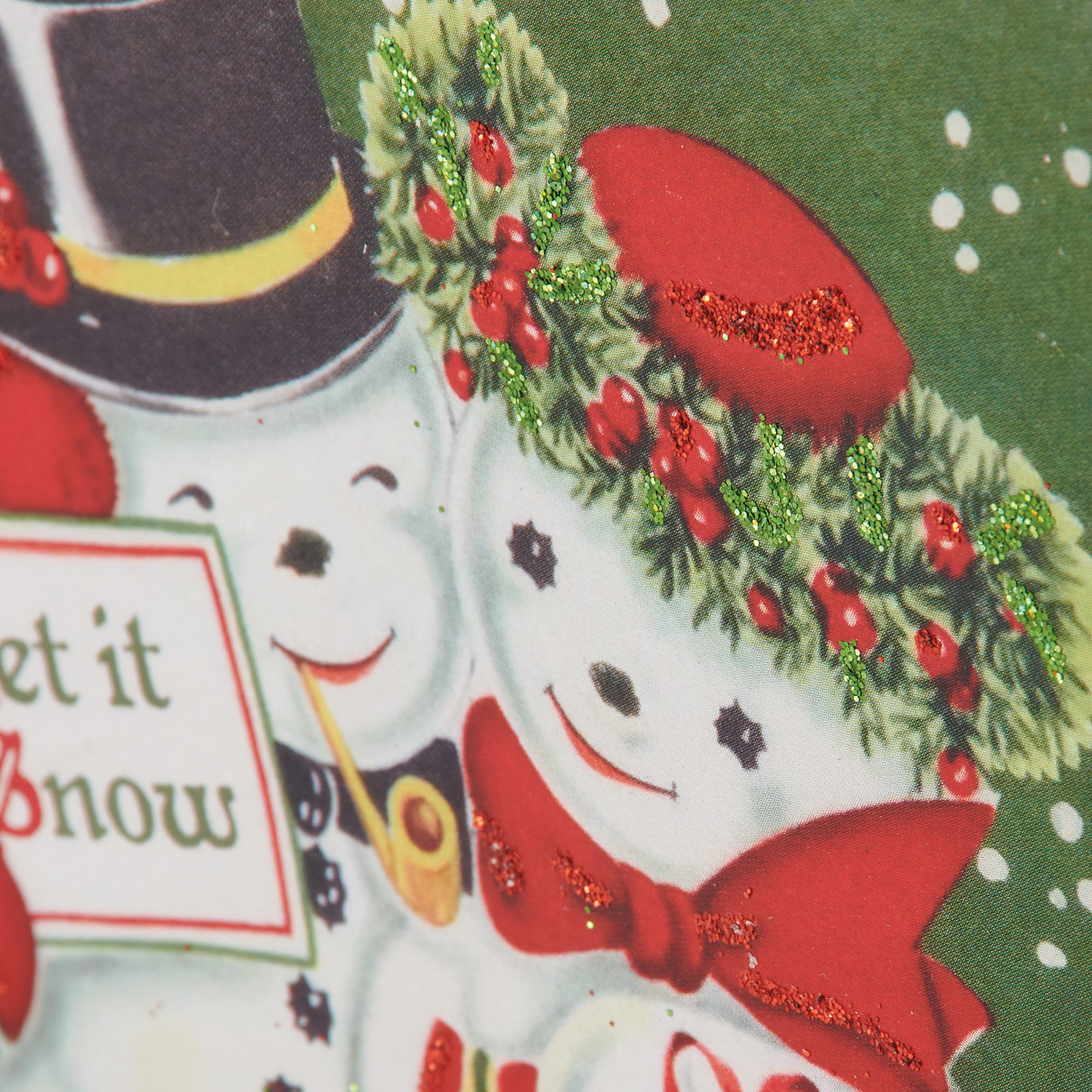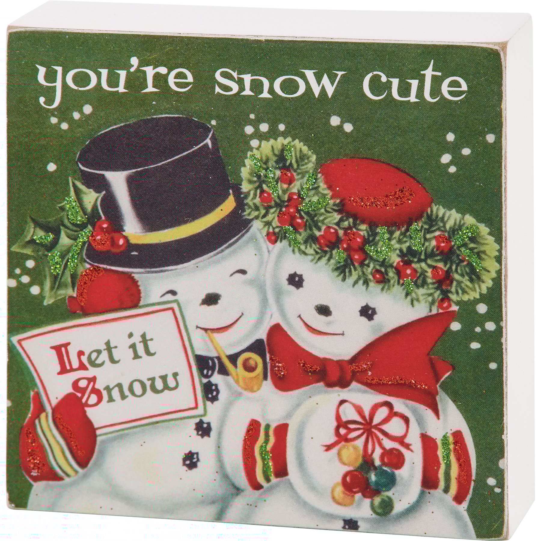 A wooden block sign from our Christmas Collection displaying vintage art of a happy snowman embracing with glitter accents and fun "You're Snow Cute" sentiment. Sides and back feature coordinating white color. Our You're Snow Cute block sign is easy to hang via predrilled keyhole slot or can free-stand alone. A jolly seasonal home accent with a variety of display options.