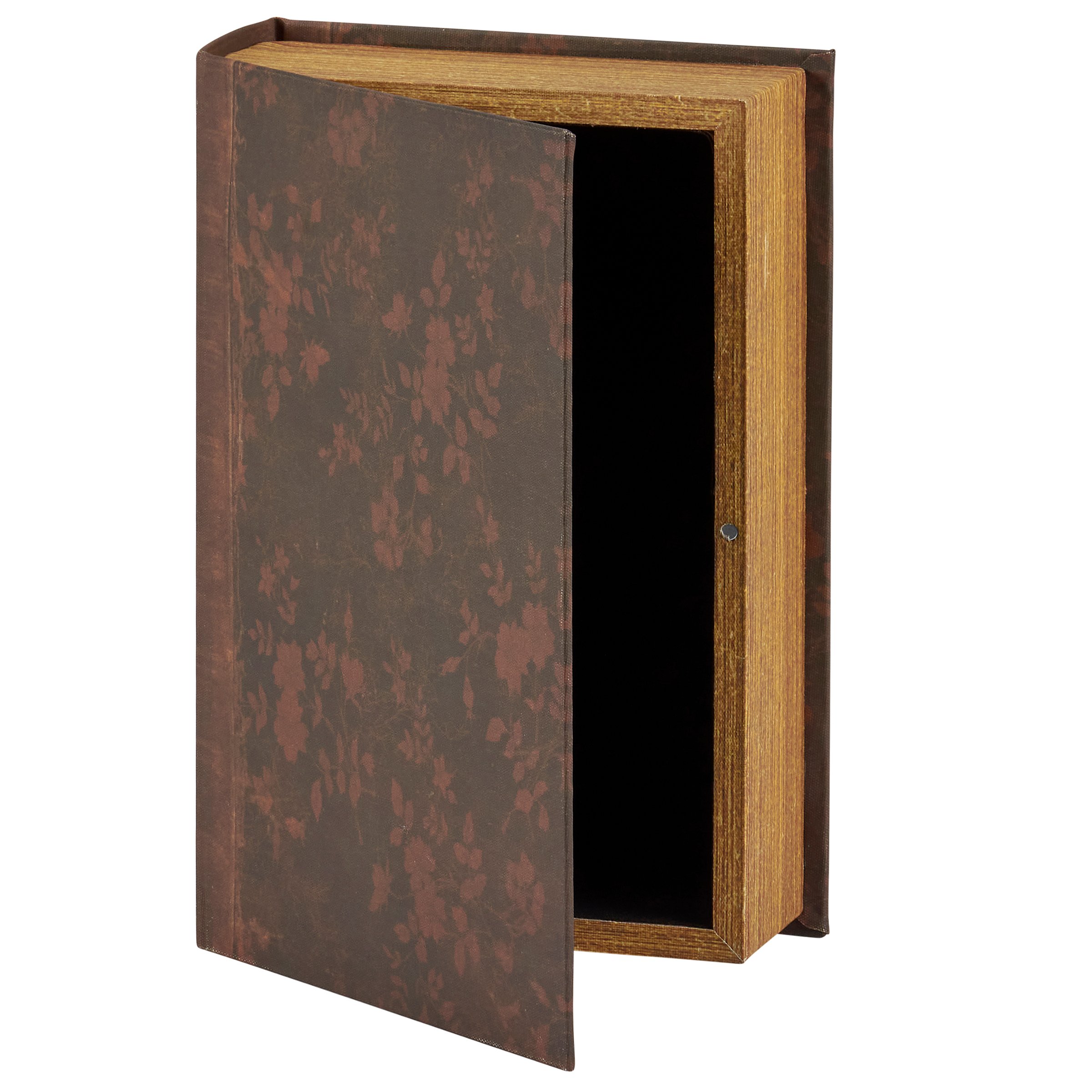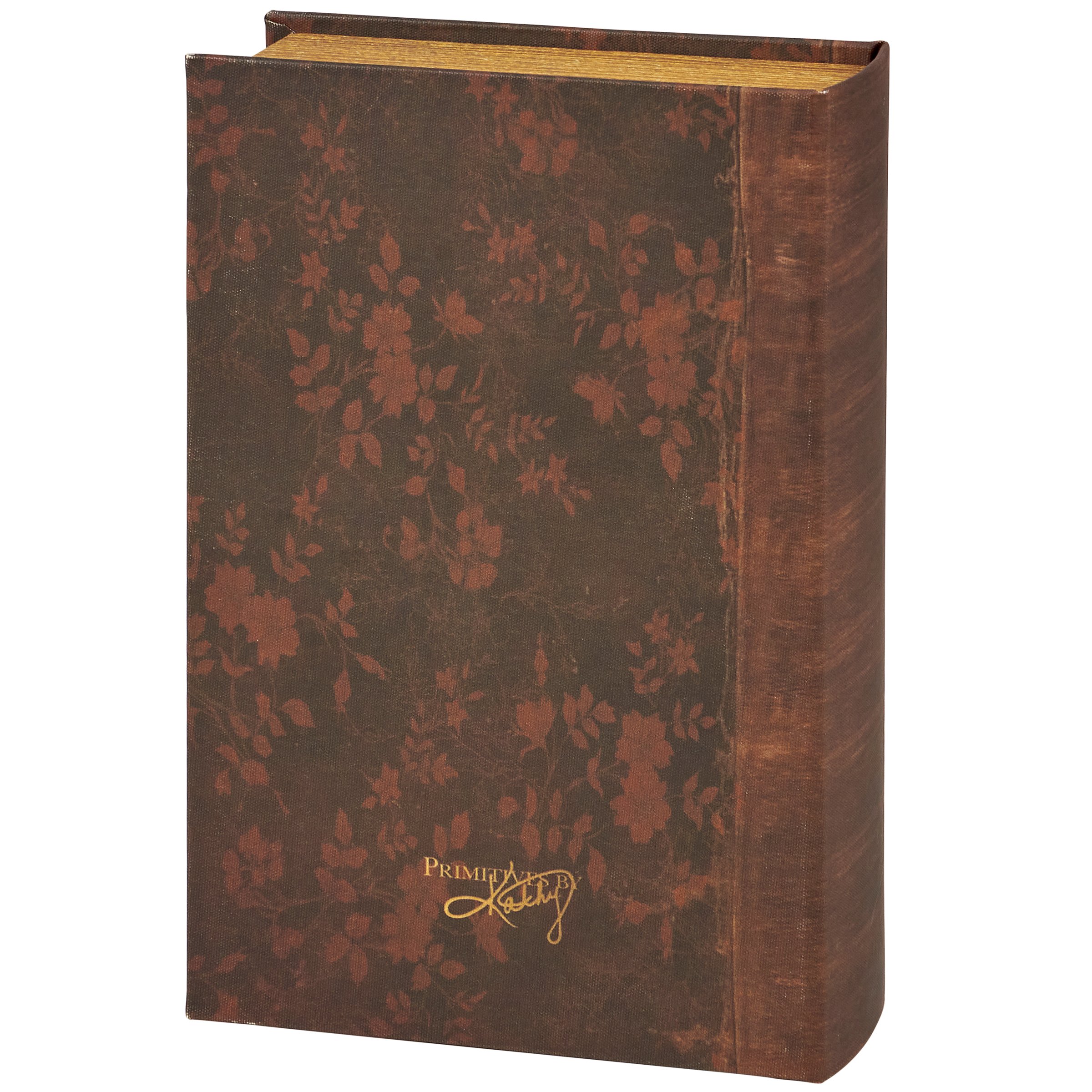 A decorative box from our Moody Collection displaying the appearance of a book inspired by Dark Academia décor. Book box features a textured canvas wrap displaying the exterior of a vintage book with floral patterns on the covers and distressed details. Front cover opens to reveal a velvet lined space for storing items and a magnet closure for secure storage when standing up. Our Dark Floral book box can be used upright as a book or displayed laying down with the cover open and decorative accents inside. Accessories pictured not included. A rustic home accent perfect for storing keepsakes or for everyday décor displays.
