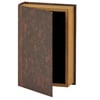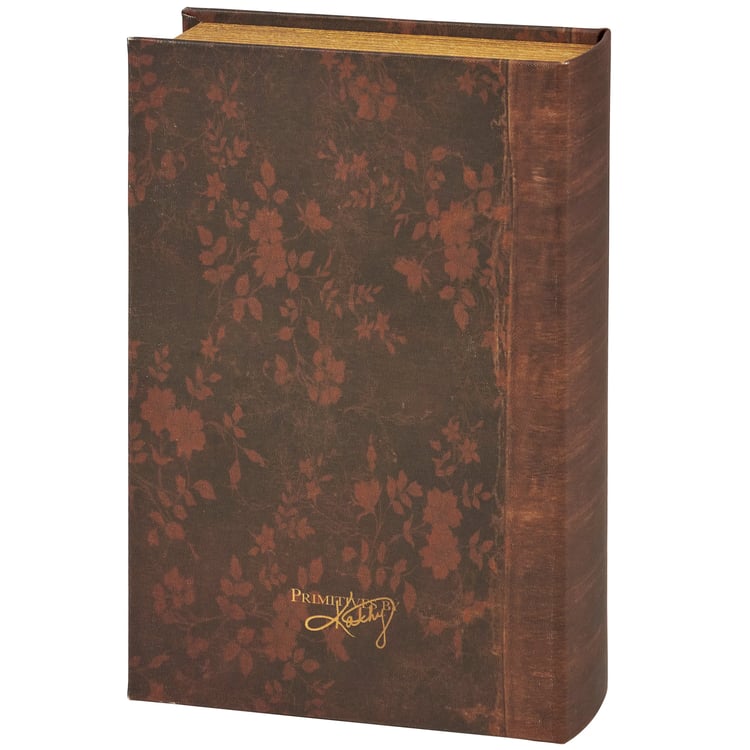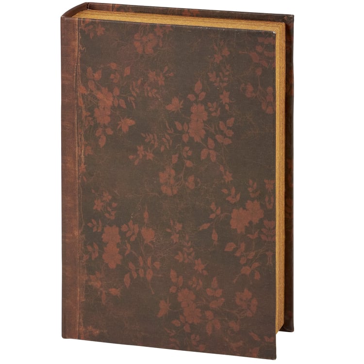 A decorative box from our Moody Collection displaying the appearance of a book inspired by Dark Academia décor. Book box features a textured canvas wrap displaying the exterior of a vintage book with floral patterns on the covers and distressed details. Front cover opens to reveal a velvet lined space for storing items and a magnet closure for secure storage when standing up. Our Dark Floral book box can be used upright as a book or displayed laying down with the cover open and decorative accents inside. Accessories pictured not included. A rustic home accent perfect for storing keepsakes or for everyday décor displays.
