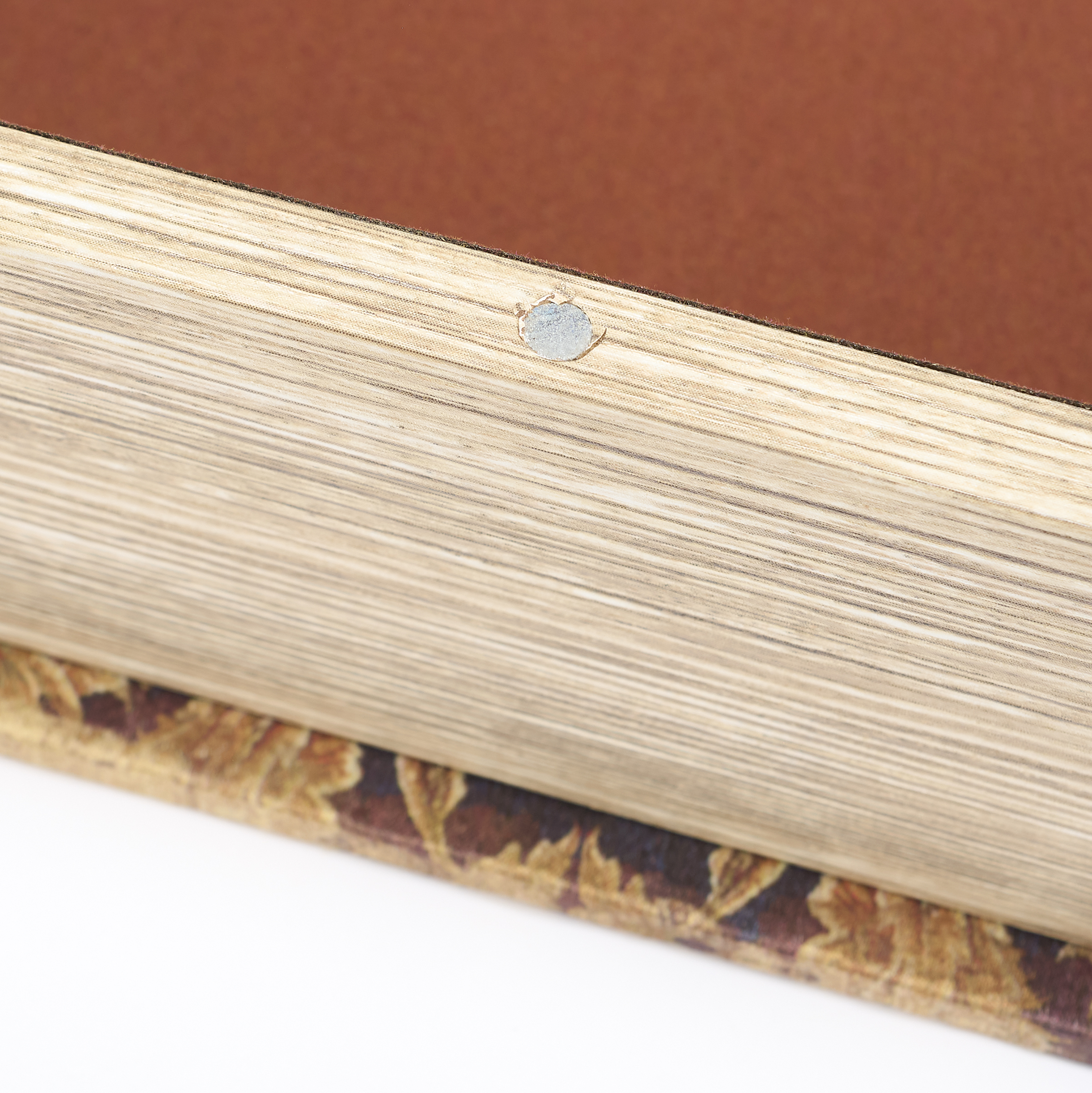 A decorative box from our Moody Collection displaying a book design inspired by moody home décor. Book box features a soft fabric wrap displaying the exterior of a vintage book with red, pink, and gold bead embellishments throughout an ornate floral design. Floral book box also displays a coordinating ornate design on its side with bead embellishments to give the appearance of a book spine when on a shelf. Front cover opens to reveal a velvet lined space for storing items with a magnet closure for secure storage when standing up. Our Embellished Floral book box can be used upright on a bookshelf or laid flat with the cover open displaying decorative accents inside. A stylish home accent perfect for storing keepsakes or for everyday home décor displays.