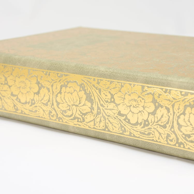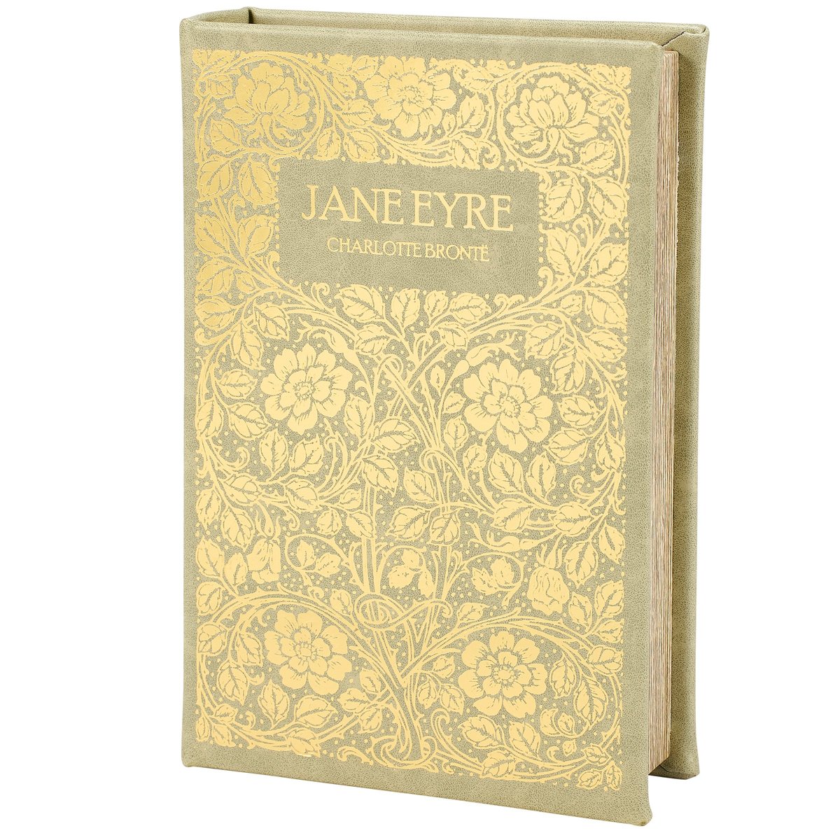 A decorative box from our Art Nouveau Collection displaying a book design inspired by art nouveau décor. Book box features a faux leather wrap displaying the exterior of a vintage "Jane Eyre" book with metallic gold details throughout an art nouveau inspired floral design. Floral book box also displays a coordinating floral design on its side with metallic gold details to give the appearance of a book spine when on a shelf. Front cover opens to reveal a velvet lined space for storing items with a magnet closure for secure storage when standing up. Our Jane Eyre book box can be used upright on a bookshelf or laid flat with the cover open displaying decorative accents inside. A vintage home accent perfect for storing keepsakes in style or for everyday home décor displays.