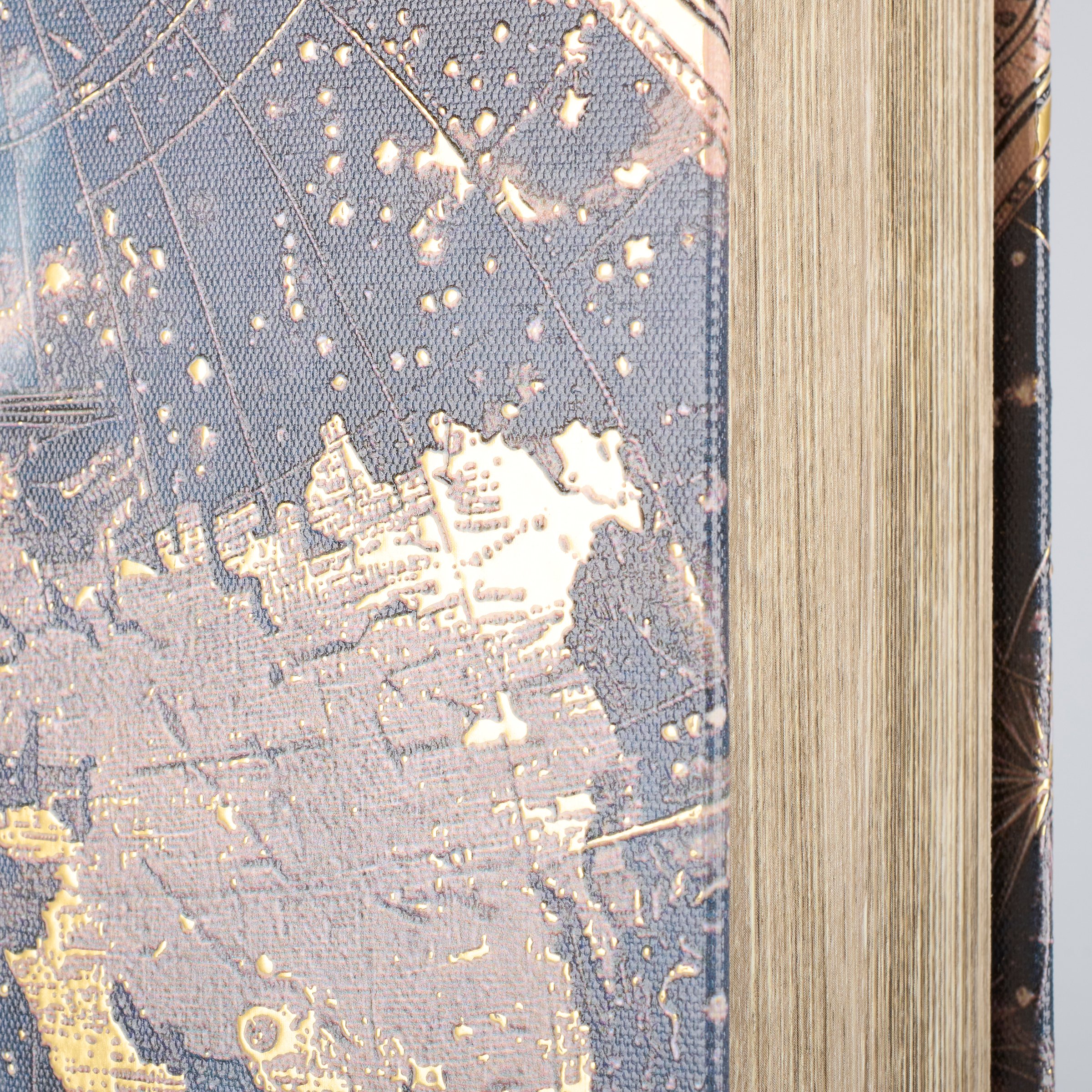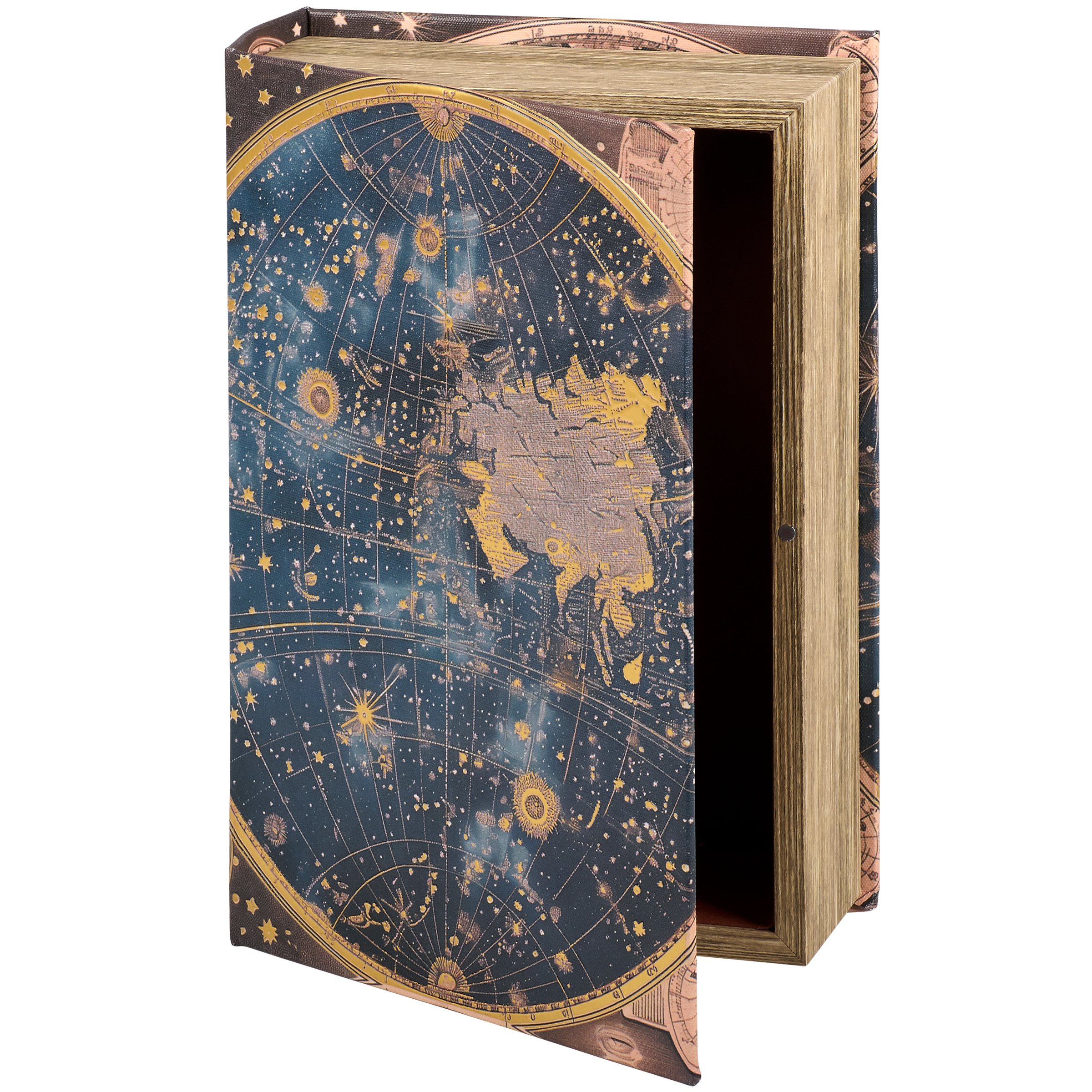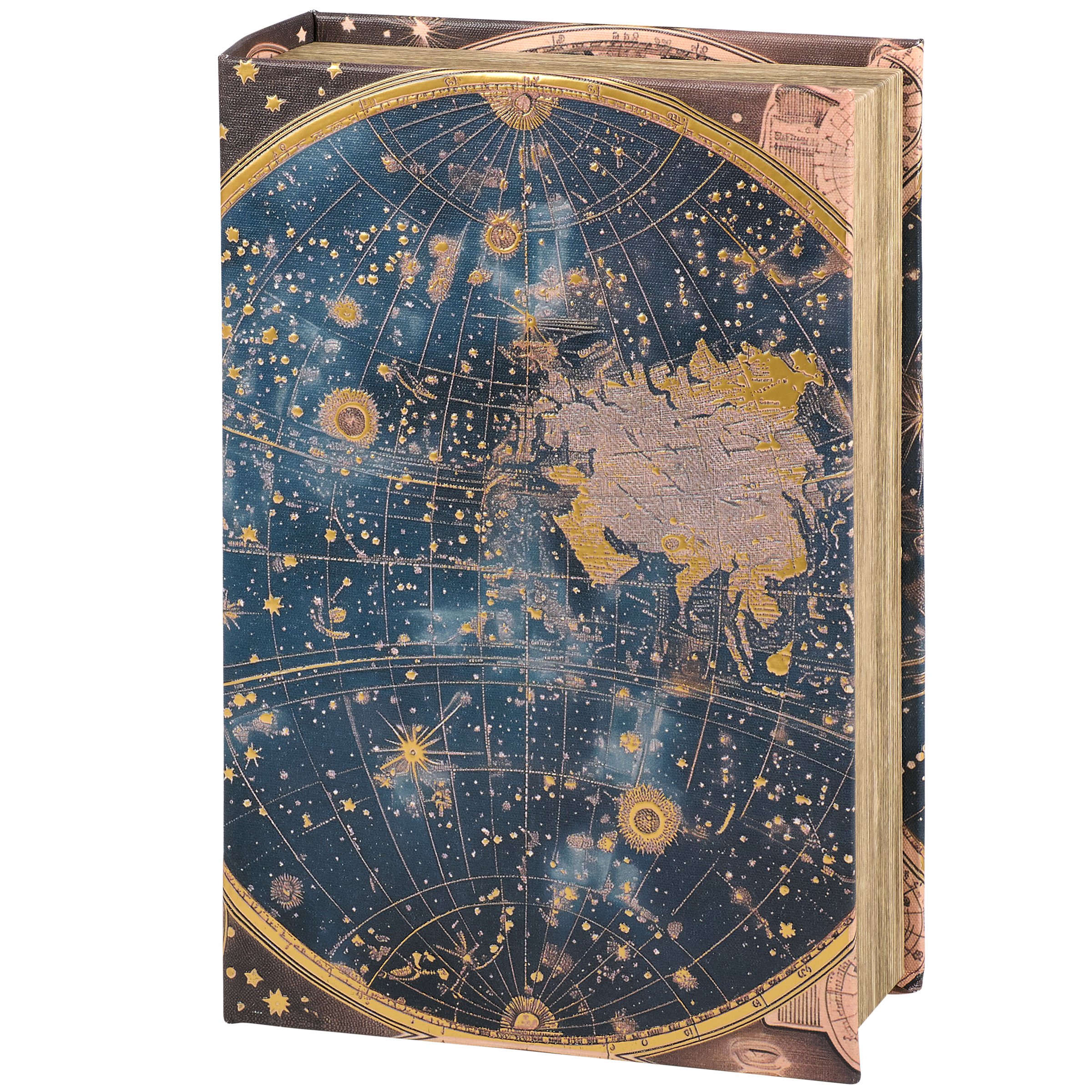 A decorative box from our Mystical Collection displaying a book design inspired by celestial maps. Decorative book box features a soft fabric wrap displaying the exterior of a vintage book with a detailed celestial maps and charts. Celestial book box also features embossed details for added dimension. Front cover opens to reveal a velvet lined space for storing items with a magnet closure for secure storage when standing up. Our Mystical book box can be used upright on a bookshelf or laid flat with the cover open displaying decorative accents inside. A stylish home accent perfect for storing keepsakes or for everyday home décor displays.