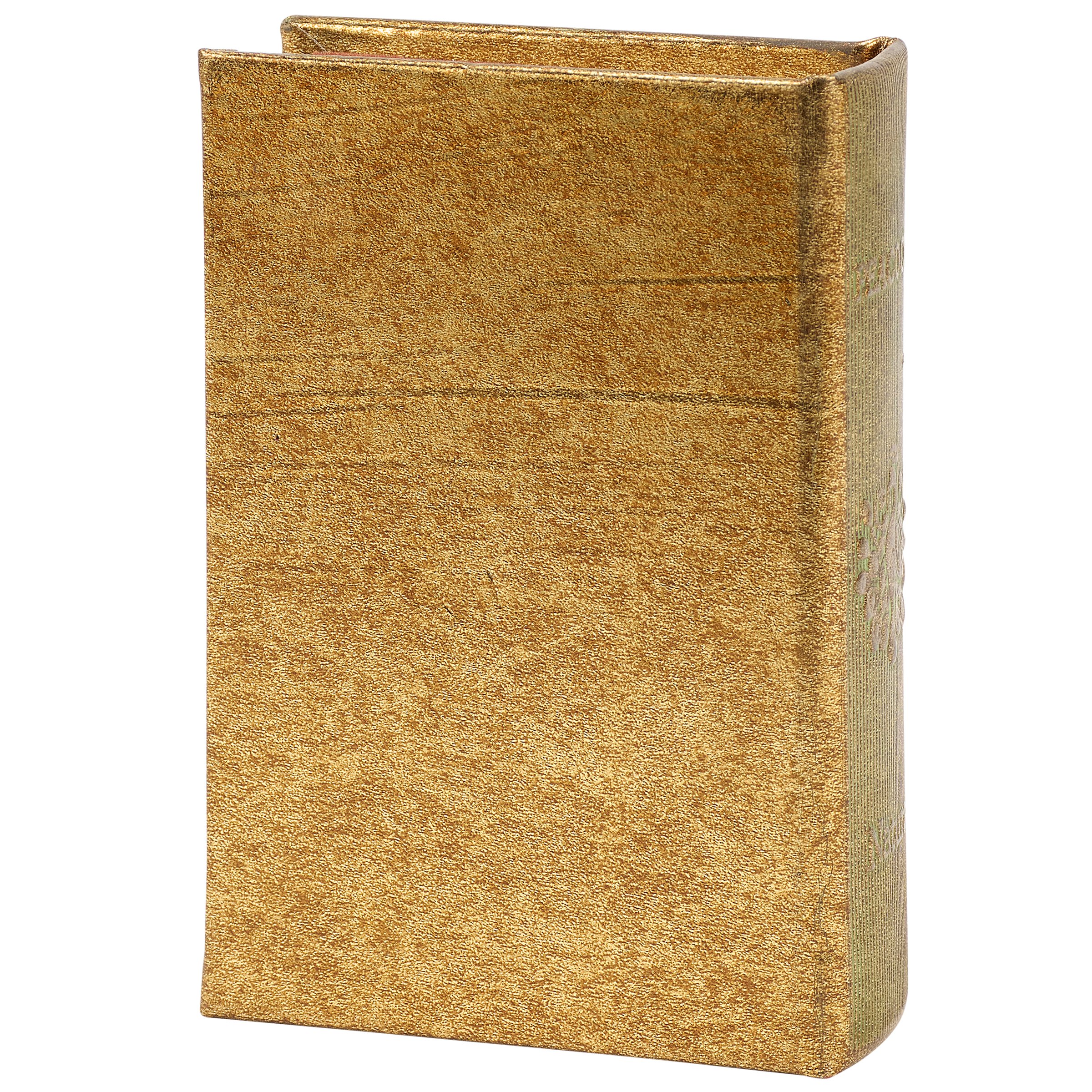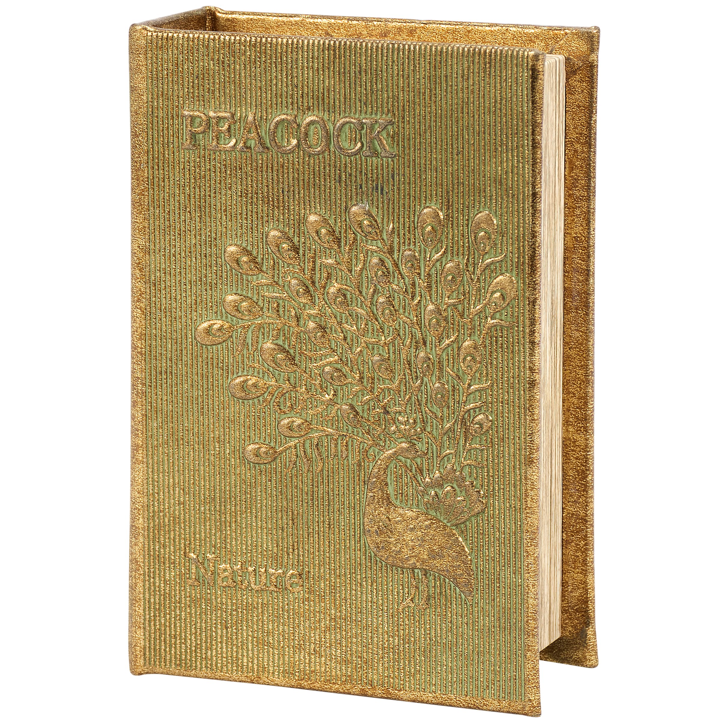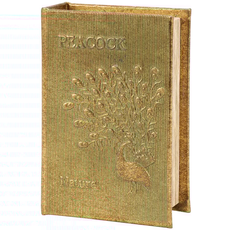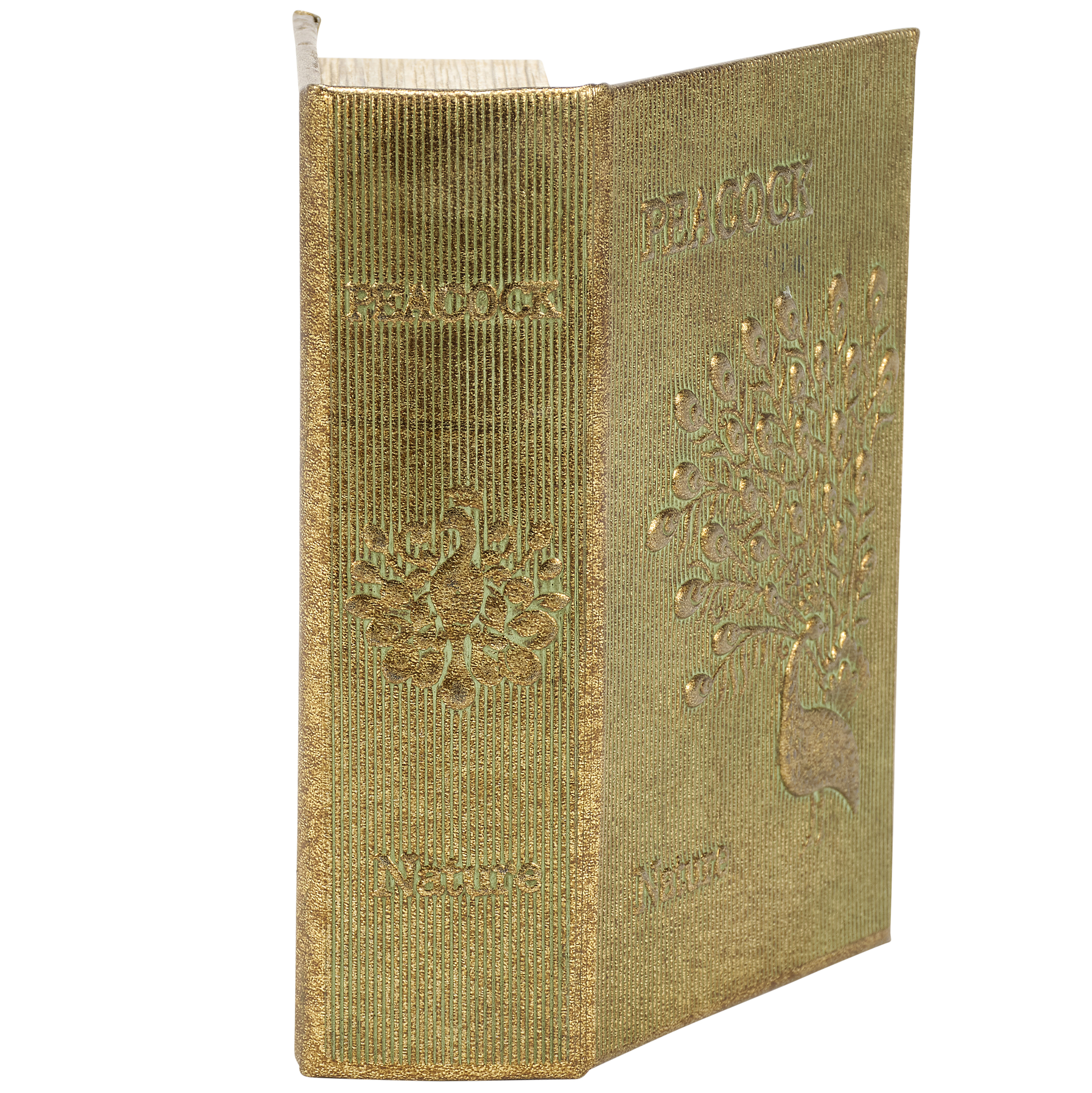 A decorative box from our Art Nouveau Collection displaying a book design inspired by art nouveau décor. Book box features a textured faux leather wrap displaying the exterior of a vintage book with a metallic gold and patina finish on an embossed peacock design. Peacock book box also displays a coordinating embossed gold and patina design on its side to give the appearance of a book spine when on a shelf. Front cover opens to reveal a velvet lined space for storing items with a magnet closure for secure storage when standing up. Our Peacock book box can be used upright on a bookshelf or laid flat with the cover open displaying decorative accents inside. A vintage home accent perfect for storing keepsakes in style or for everyday home décor displays.
