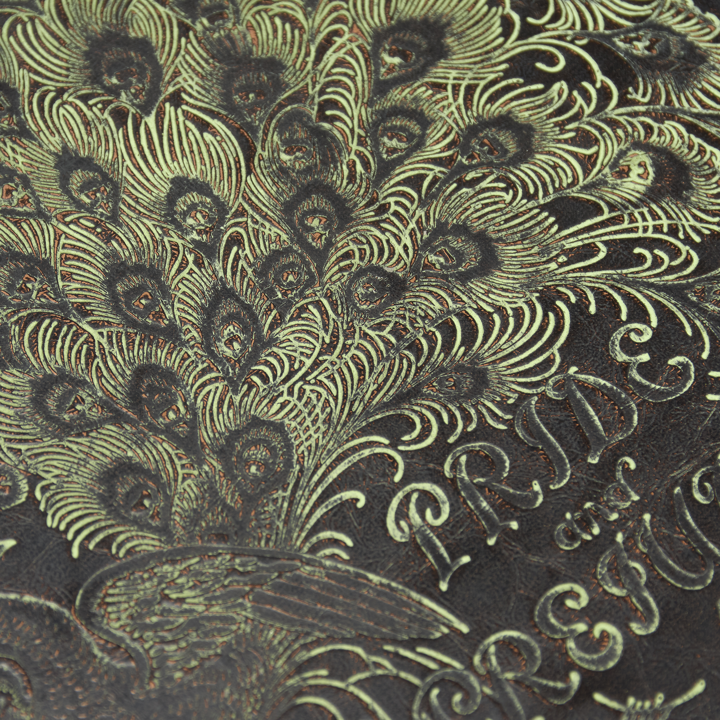 A decorative box from our Art Nouveau Collection displaying a book design inspired by art nouveau décor. Book box features a faux leather wrap displaying the exterior of a vintage "Pride And Prejudice" book with distressed accents and embossed details throughout an art nouveau inspired feather design. Vintage book box also displays a coordinating design on its side with embossed details for the "Pride And Prejudice" title, author, and illustrator giving the appearance of a book spine when on a shelf. Front cover opens to reveal a velvet lined space for storing items with a magnet closure for secure storage when standing up. Our Pride And Prejudice book box can be used upright on a bookshelf or laid flat with the cover open displaying decorative accents inside. A vintage home accent perfect for storing keepsakes in style or for everyday home décor displays.
