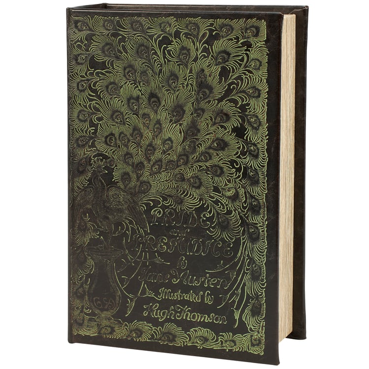 A decorative box from our Art Nouveau Collection displaying a book design inspired by art nouveau décor. Book box features a faux leather wrap displaying the exterior of a vintage "Pride And Prejudice" book with distressed accents and embossed details throughout an art nouveau inspired feather design. Vintage book box also displays a coordinating design on its side with embossed details for the "Pride And Prejudice" title, author, and illustrator giving the appearance of a book spine when on a shelf. Front cover opens to reveal a velvet lined space for storing items with a magnet closure for secure storage when standing up. Our Pride And Prejudice book box can be used upright on a bookshelf or laid flat with the cover open displaying decorative accents inside. A vintage home accent perfect for storing keepsakes in style or for everyday home décor displays.