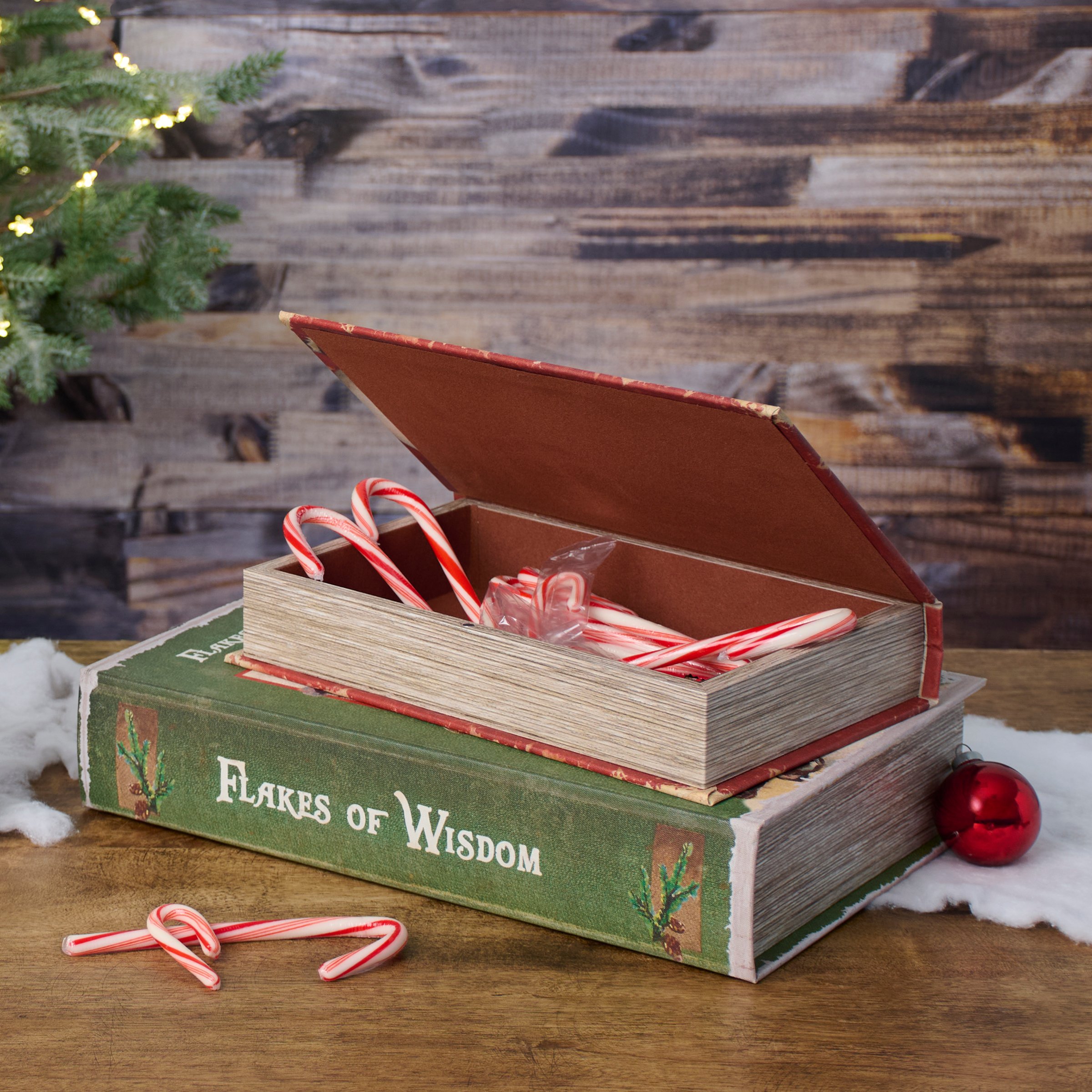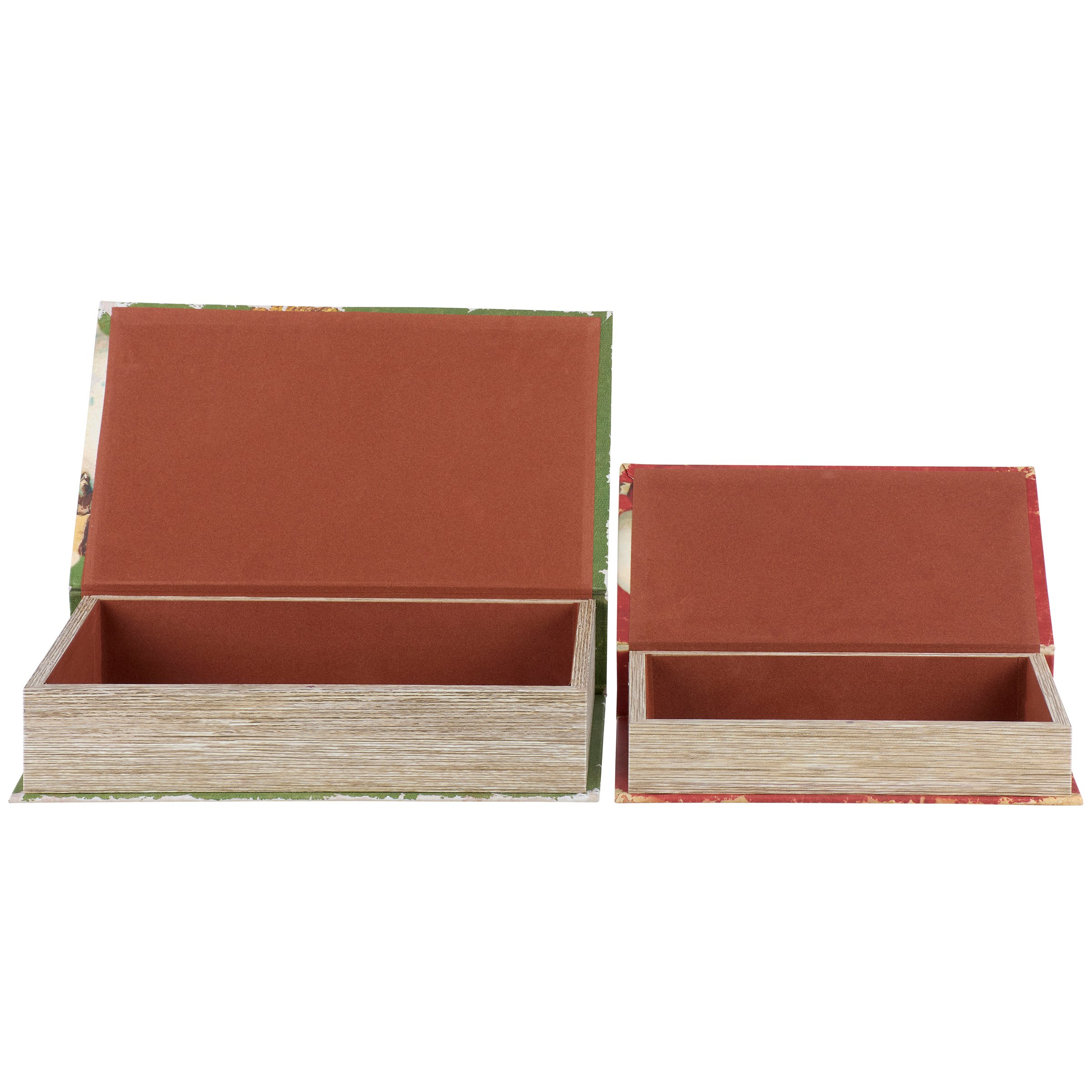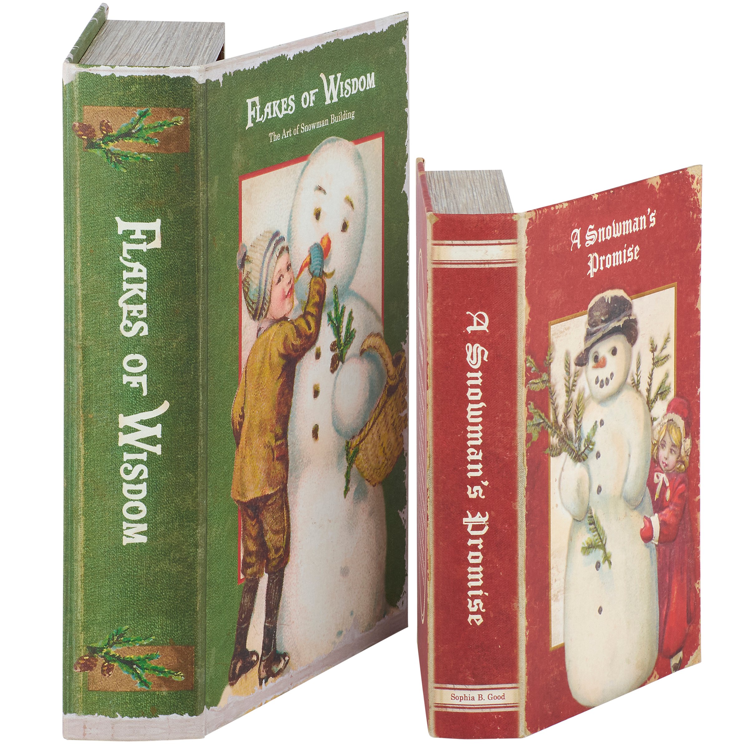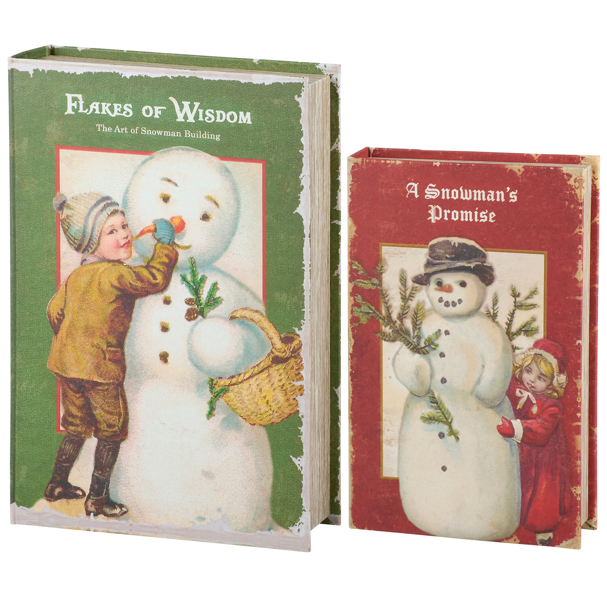 A set of 2 decorative boxes from our Christmas Collection displaying coordinating book designs in different sizes inspired by vintage Christmas home décor. Each Christmas book box features a textured canvas wrap displaying the exterior of a vintage book with distressed details and classic snowman designs as well as titles including "Flakes of Wisdom - The Art Of Snowman Building" and "A Snowman's Promise." This set of vintage snowman book boxes also display coordinating title designs on the side to give the appearance of a book spine when on a shelf and a synopsis on the back for each book. The front covers open to reveal a velvet lined space for storing items with a magnet closure for secure storage when standing up. Our Flakes Of Wisdom book box set can be used upright on a bookshelf or laid flat with the cover open displaying decorative accents inside. A set of snowman themed home accents perfect for storing keepsakes in style or for decorating vintage Christmas displays.