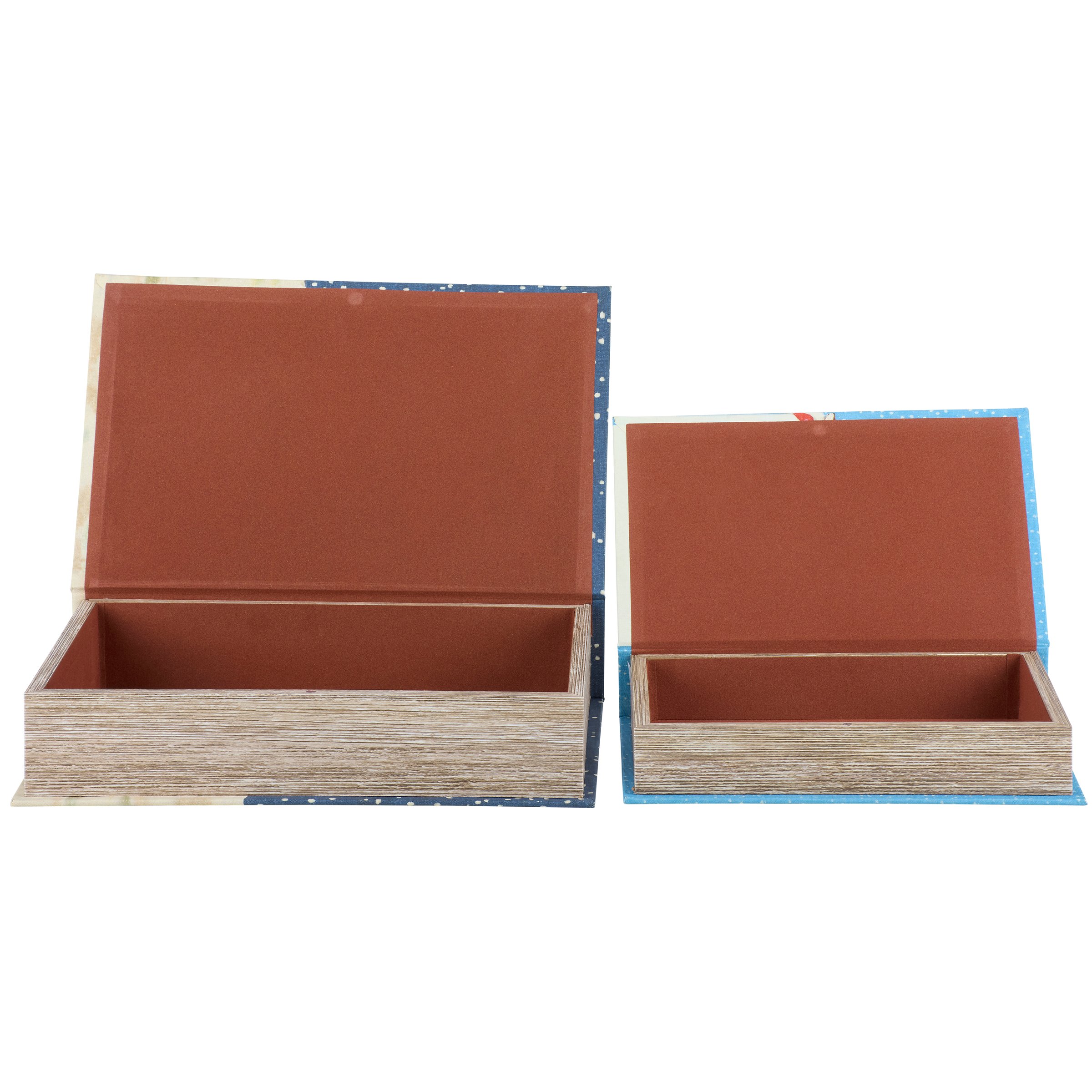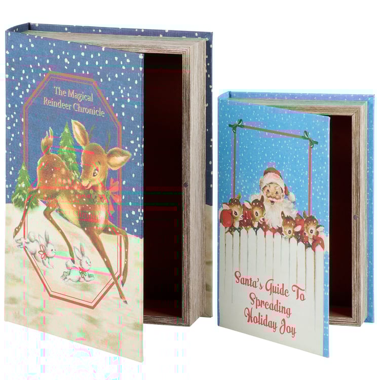 A set of 2 decorative boxes from our Christmas Collection displaying coordinating book designs in different sizes inspired by retro Christmas home décor. Each Christmas book box features a textured canvas wrap displaying the exterior of a vintage book with distressed details and colorful reindeer designs as well as titles including "The Magical Reindeer Chronicle" and "Santa's Guide To Spreading Holiday Joy." This set of retro Christmas book boxes also display coordinating title designs on the side to give the appearance of a book spine when on a shelf and a synopsis on the back for each book. The front covers open to reveal a velvet lined space for storing items with a magnet closure for secure storage when standing up. Our Magical Reindeer Chronicle book box set can be used upright on a bookshelf or laid flat with the cover open displaying decorative accents inside. A set of reindeer themed home accents perfect for storing keepsakes in style or for decorating retro Christmas displays.