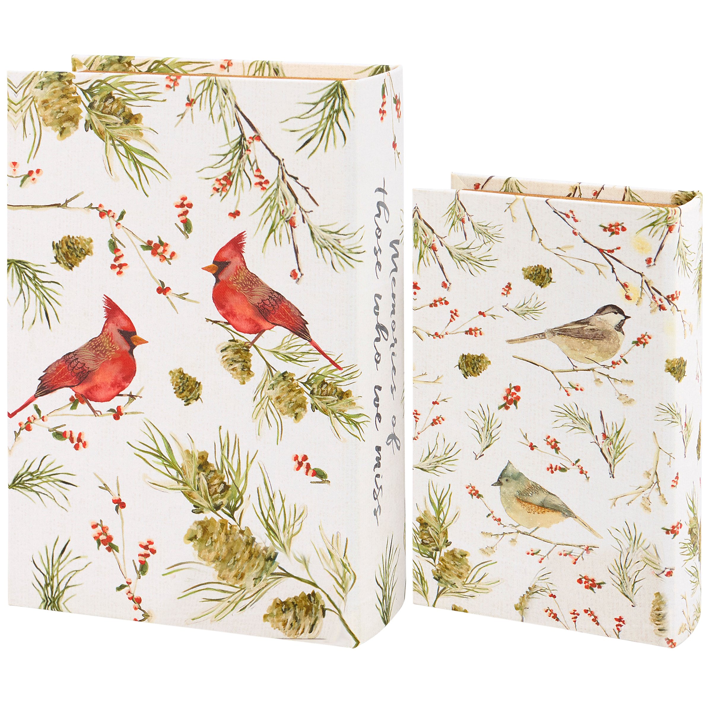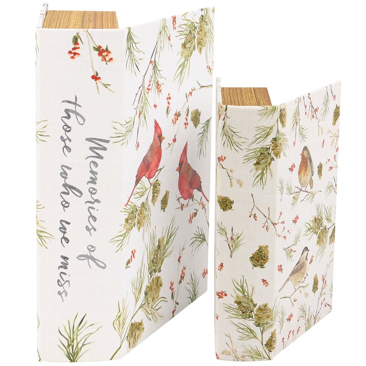 A set of 2 decorative boxes from our Christmas Collection featuring coordinating cardinal designs in different sizes. Seasonal book boxes feature a textured canvas wrap displaying the exterior of a book with patterns of cardinals on winter branches for the front and back covers. Cardinal designs are replicated from original art hand painted in a unique watercolor style. Winter book boxes also display coordinating winter branch designs on the side with a heartwarming sentiment that reads "Memories Of Those Who We Miss." Front covers open to reveal a velvet lined space for storing photos or other mementos with a magnet closure for secure storage when standing up. Our Memories book box set can be used upright on a bookshelf or laid flat with the cover open displaying the mementos inside. Accessories pictured not included. A set of seasonal home accents perfect for storing keepsakes or for winter décor displays.