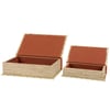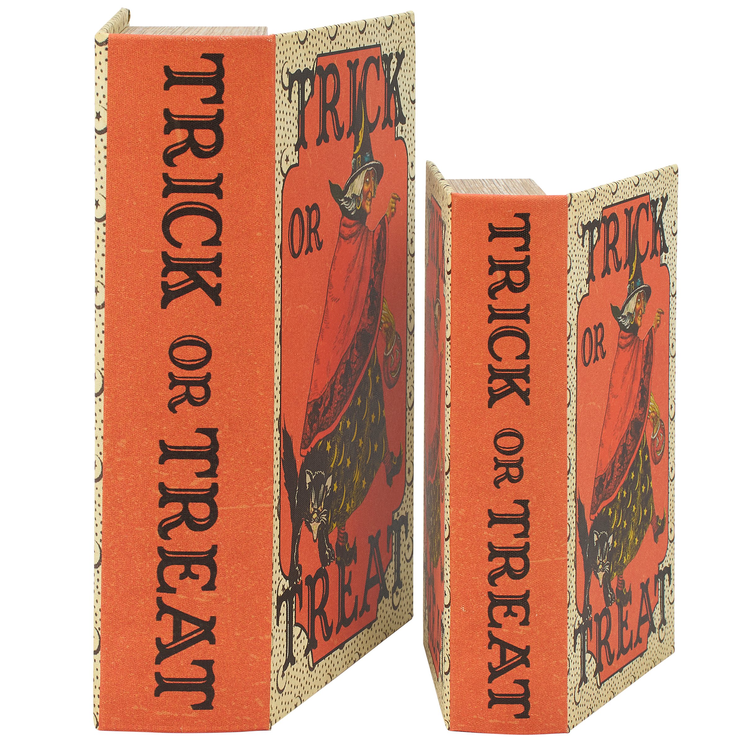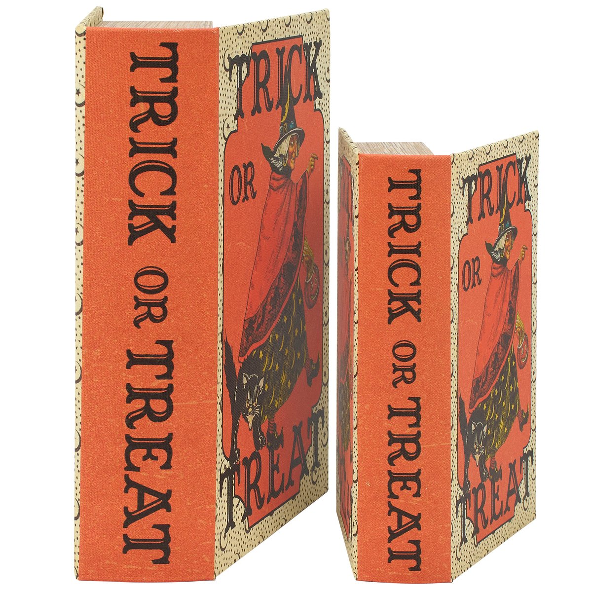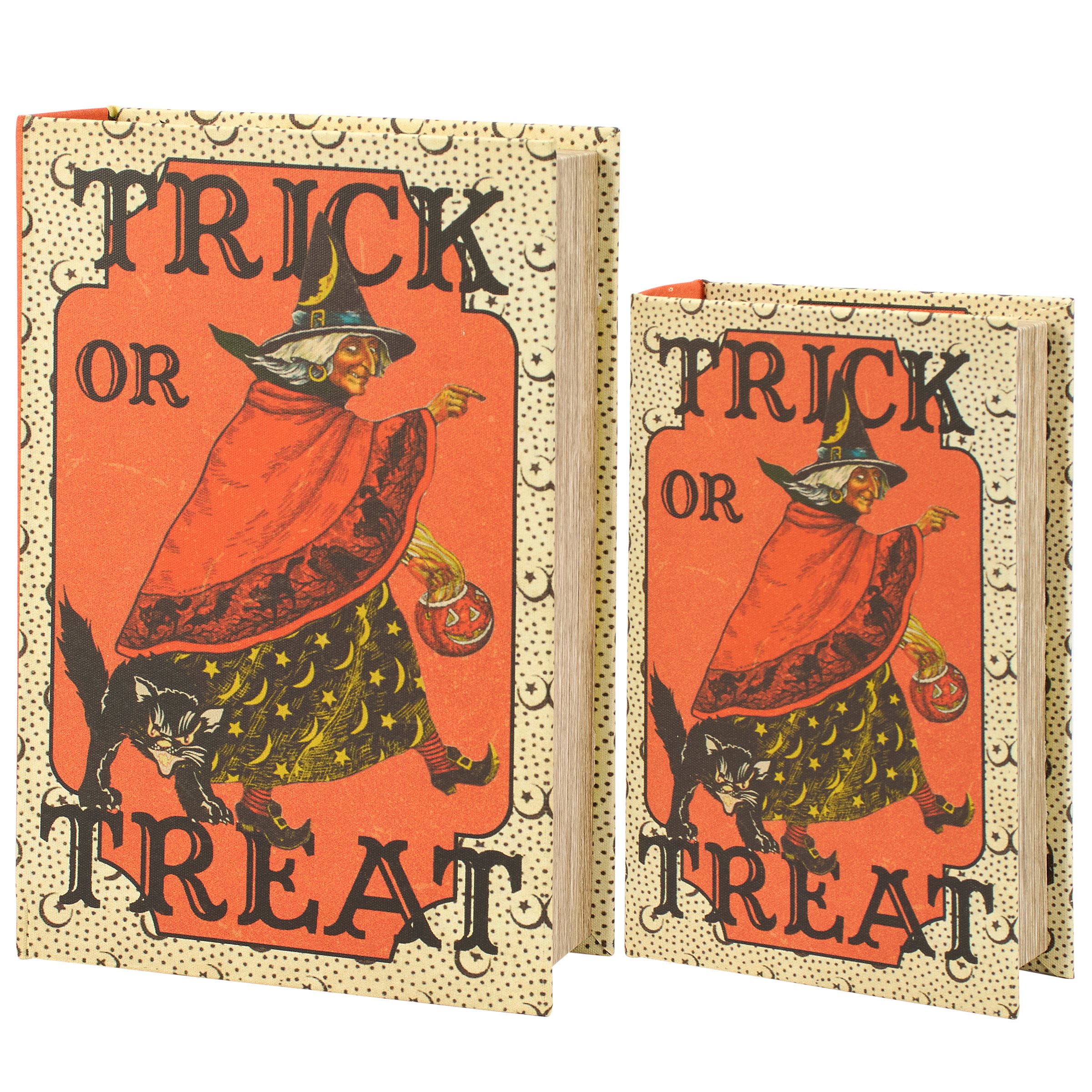 A set of 2 decorative boxes from our Halloween Collection featuring coordinating retro Halloween designs in different sizes. Halloween book boxes feature a textured canvas wrap displaying the exterior of a book with vintage art of a witch and black cat between a seasonal sentiment that reads "Trick Or Treat" for the front and back covers. Seasonal book boxes also display "Trick Or Treat" sentiment on the side. Front covers open to reveal a velvet lined space for storing items with a magnet closure for secure storage when standing up. Our Trick Or Treat book box set can be used upright on a bookshelf or laid flat with the cover open displaying decorative accents inside. Accessories pictured not included. A set of seasonal home accents perfect for storing keepsakes or for Halloween décor displays.