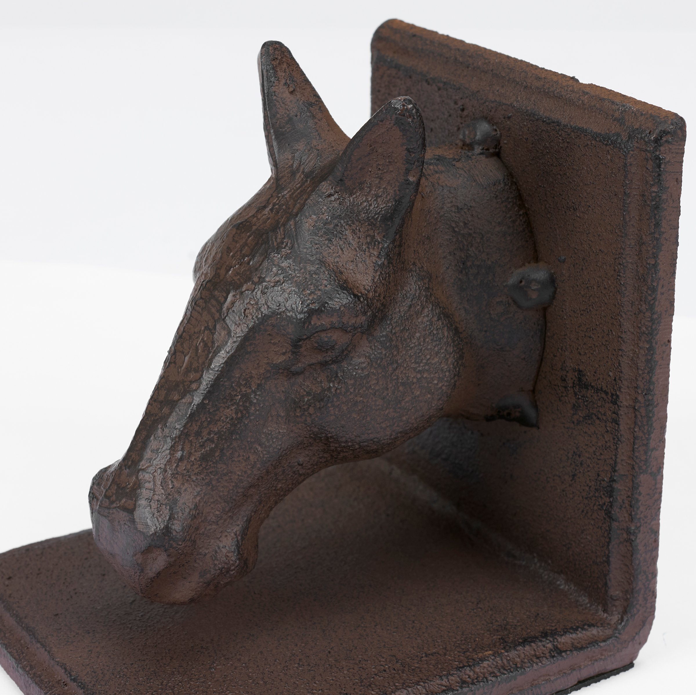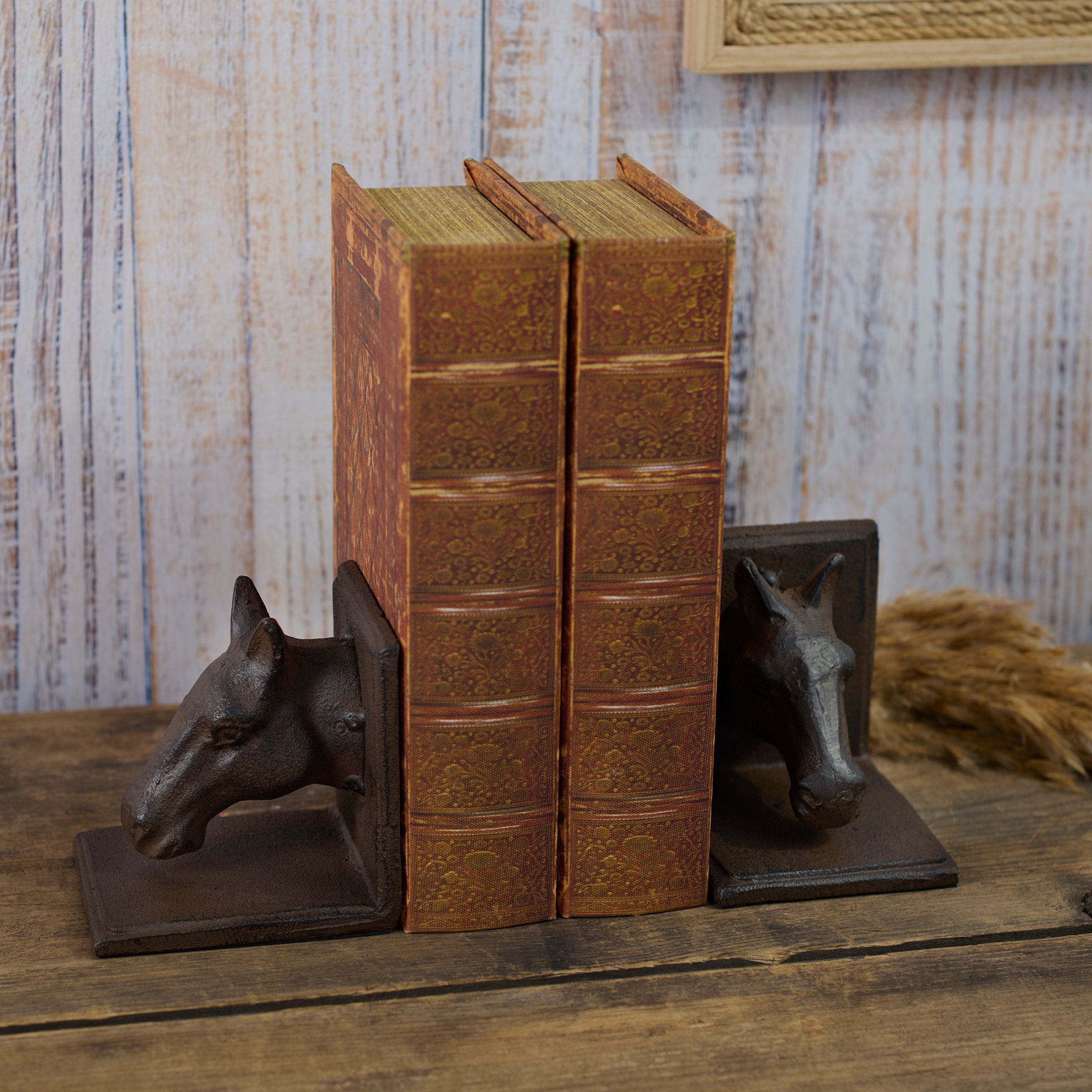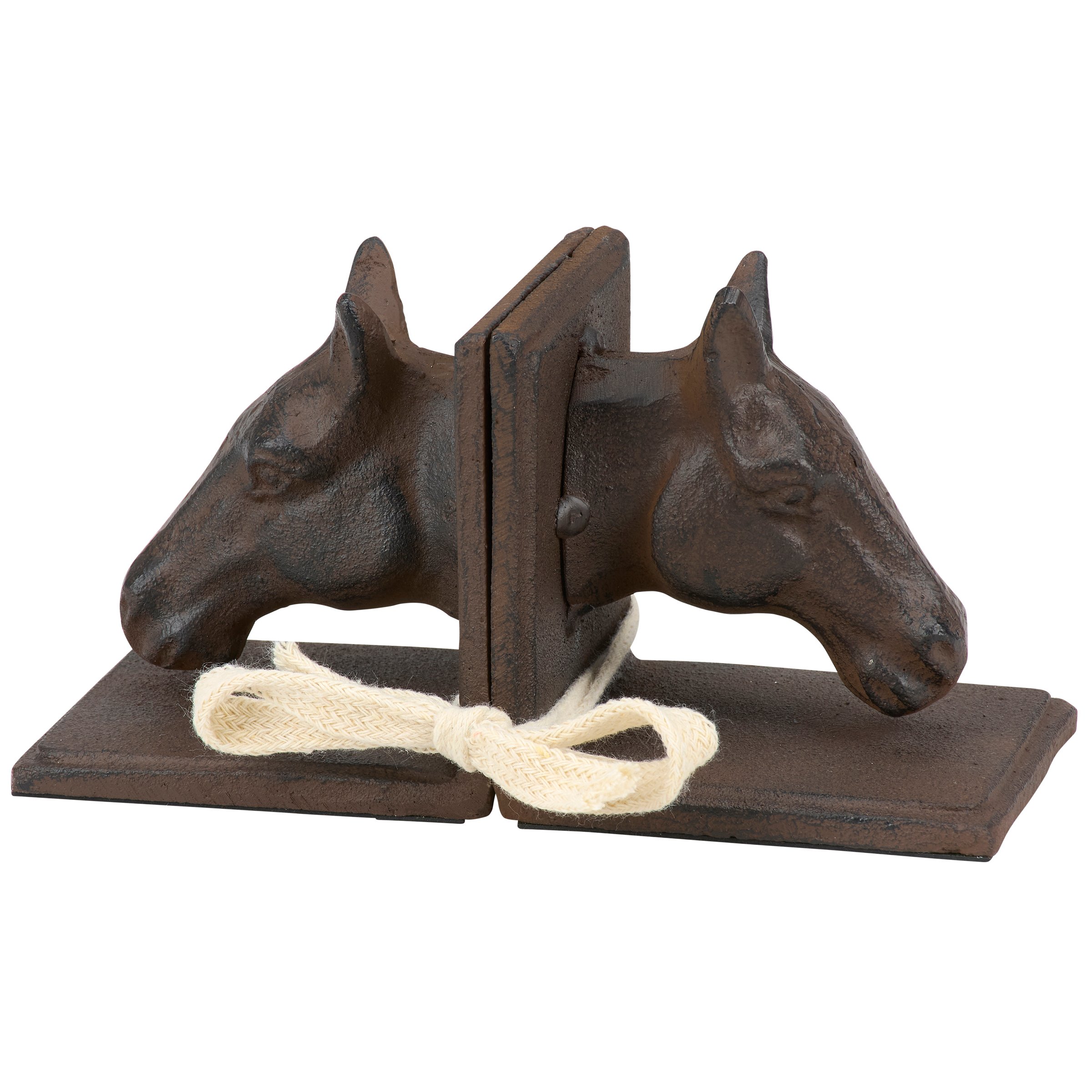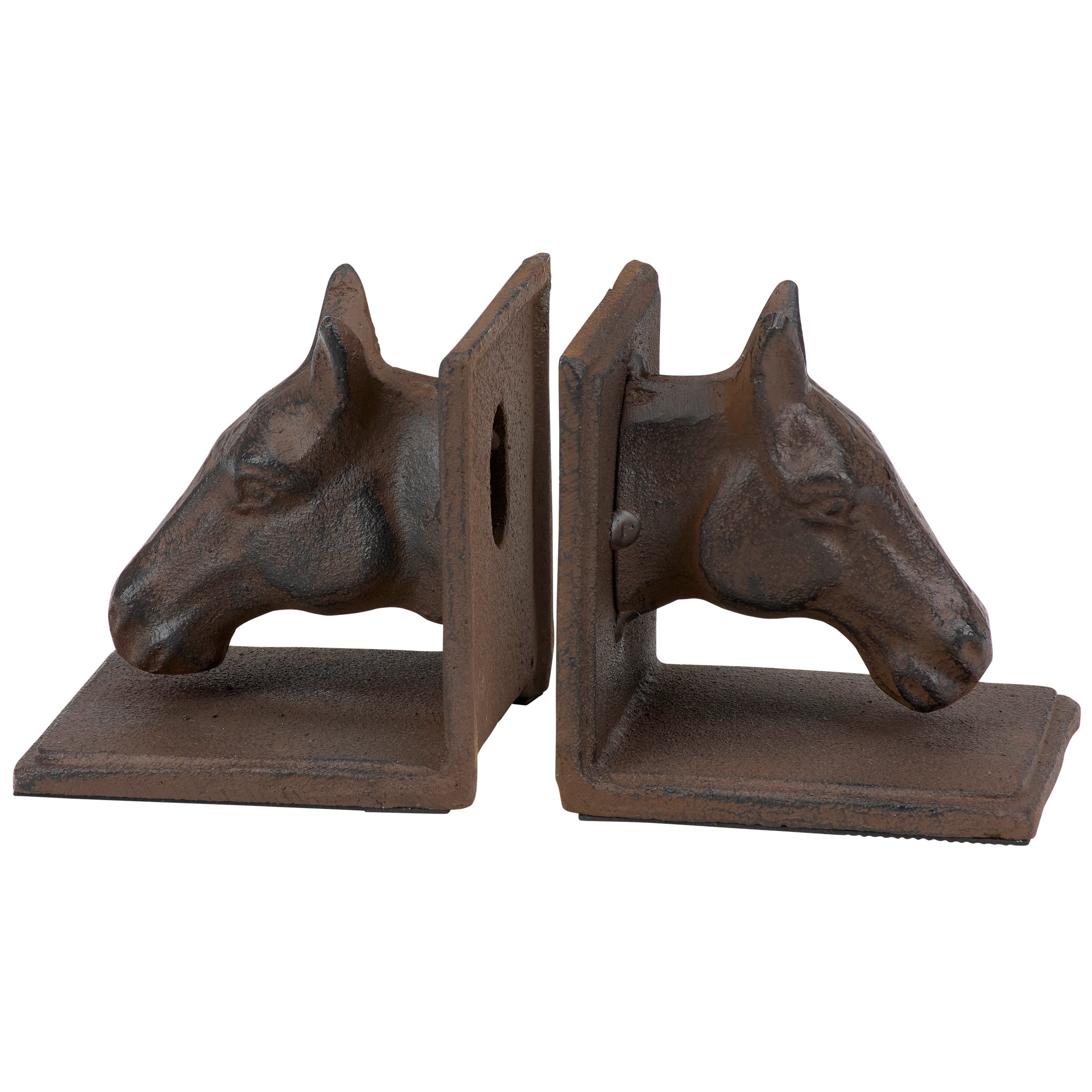 A set of coordinating metal bookends from our Western Collection displaying a rustic design inspired by western home decor. Each bookend features sculpted horse head designs with antique finish and a sturdy base. Our Horse Head bookends are packaged together with tied white cotton tape making it great for gifting. A set of rustic home accents perfect for adding western style to any bookshelf.