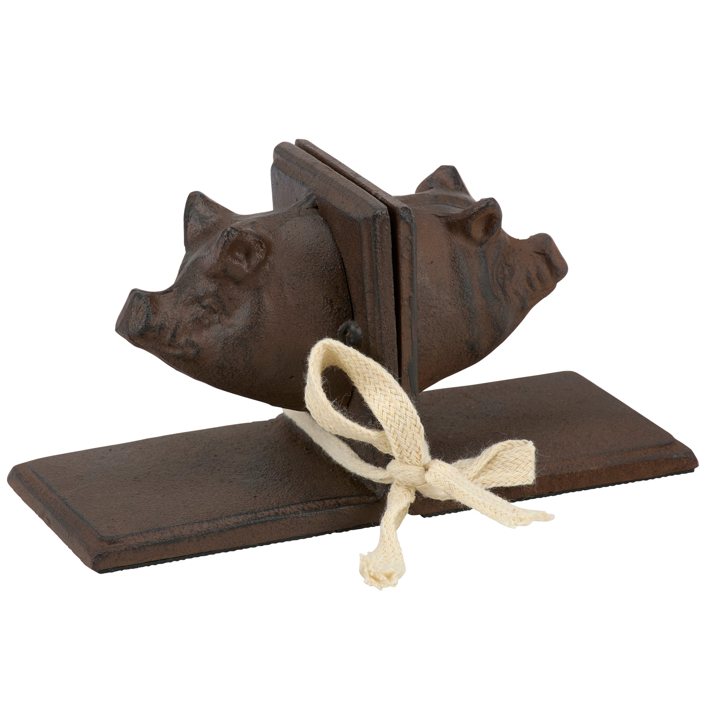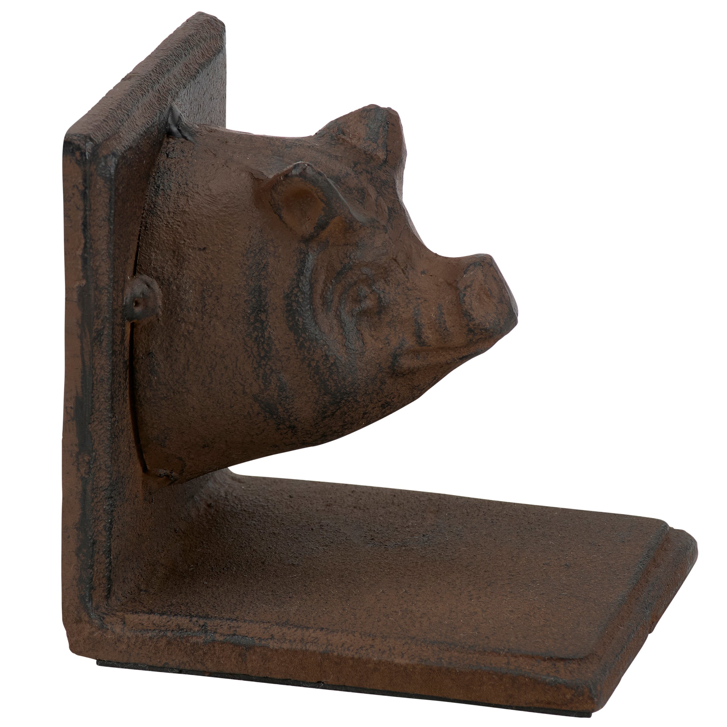 A set of coordinating metal bookends from our Farmhouse Collection displaying a rustic design inspired by farmhouse home decor. Each bookend features sculpted pig head designs with antique finish and a sturdy base. Our Pig bookends are packaged together with tied white cotton tape making it great for gifting. A set of rustic home accents perfect for adding farmhouse style to any bookshelf.