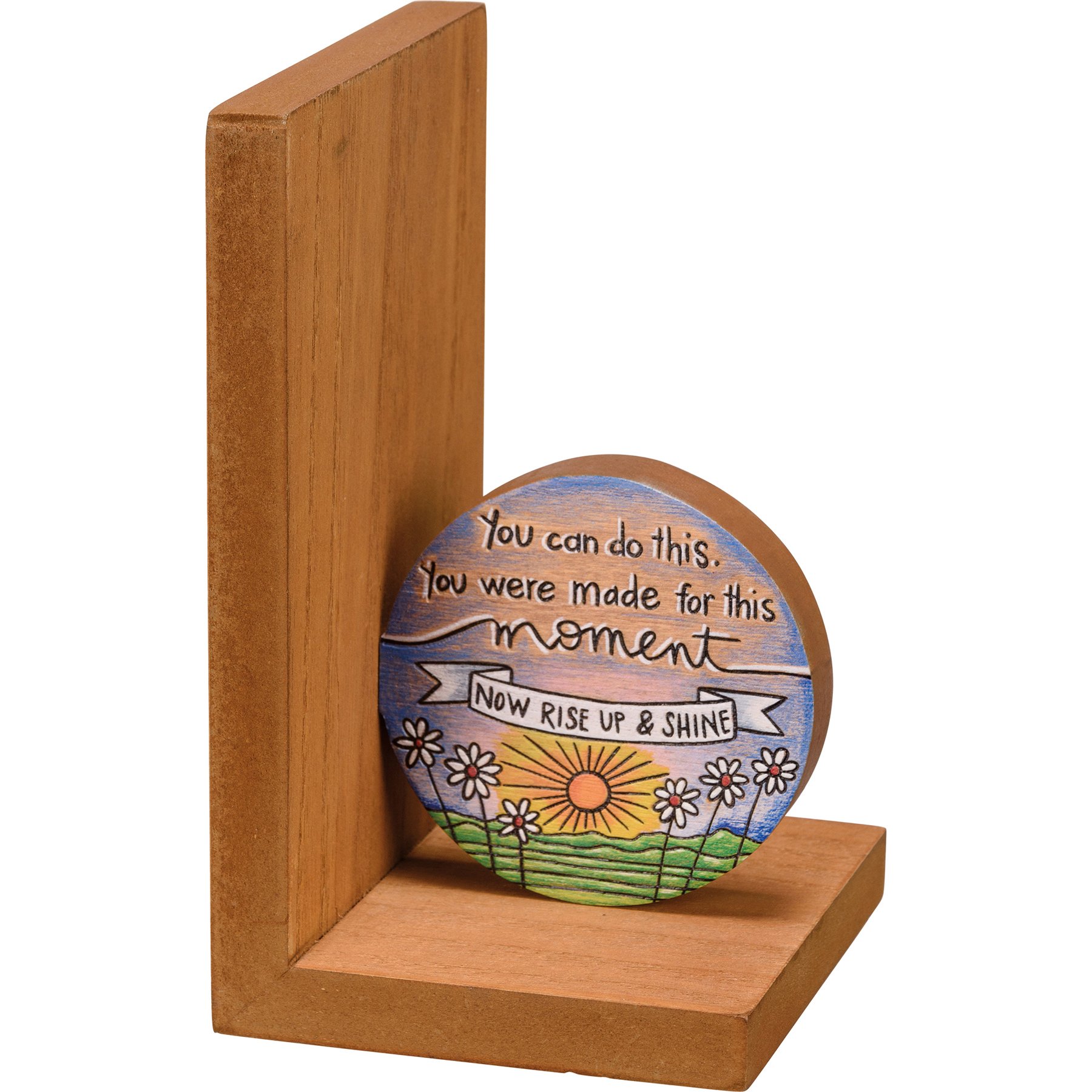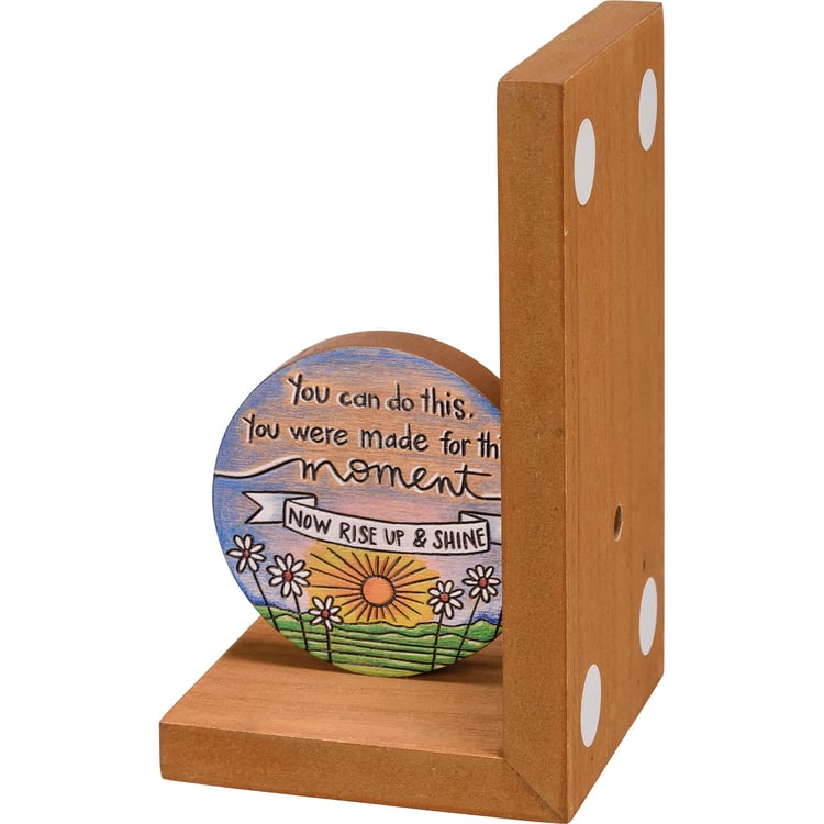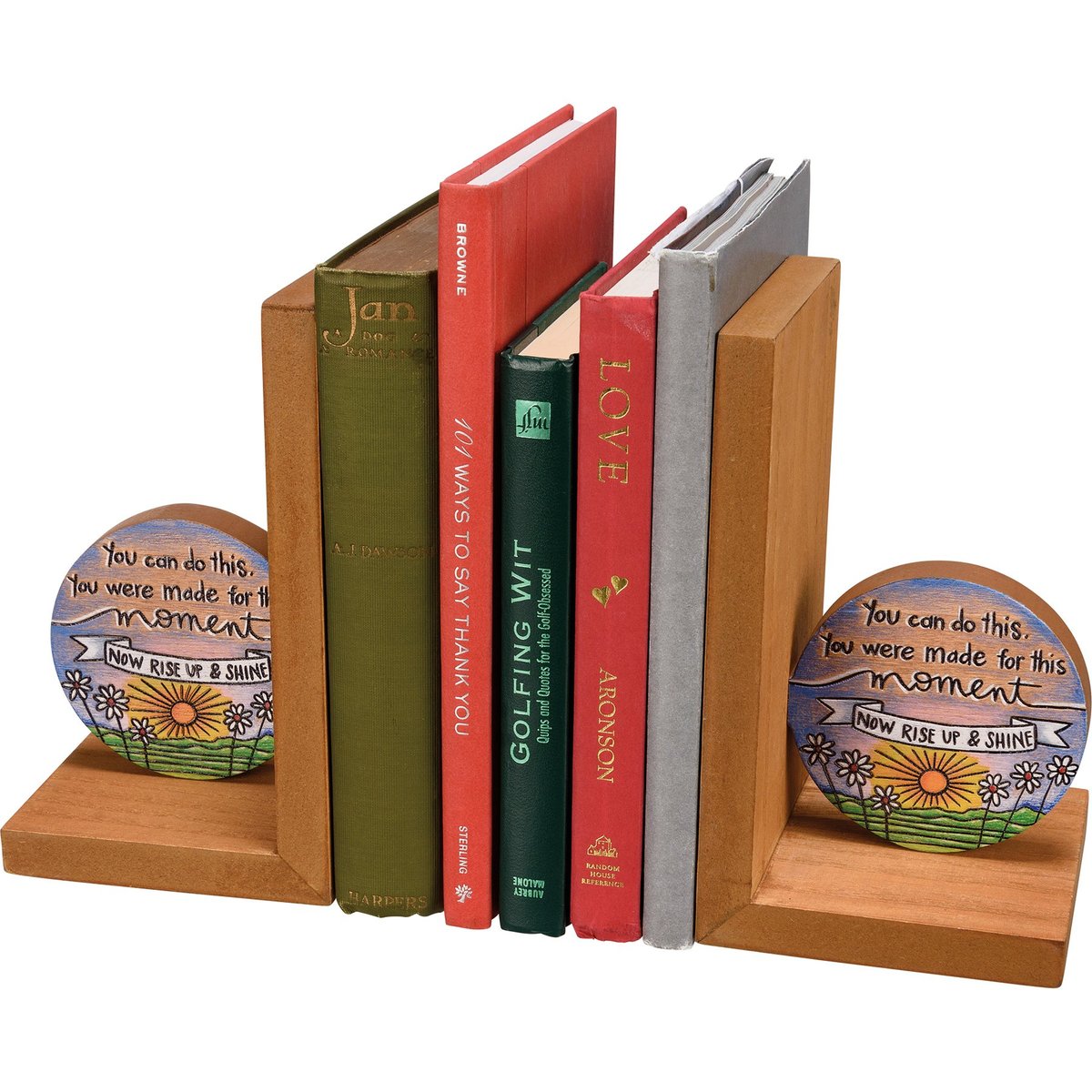 Add personality and character to any bookshelf or desk with these bookends featuring "You Can Do This You Were Made For This Moment Now Rise Up & Shine" sentiment with colorful wood burned designs. Our You Were Made For This Moment book ends contain bottom rubber feet to hold in place on any surface.