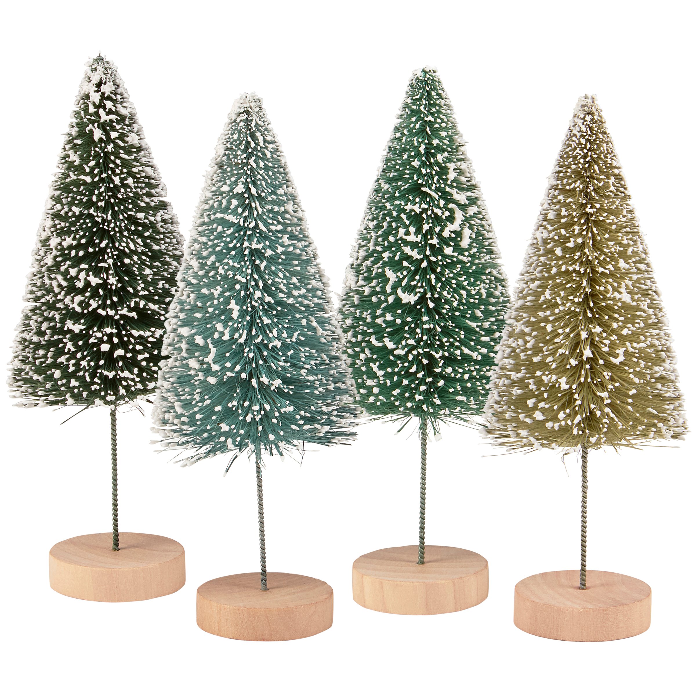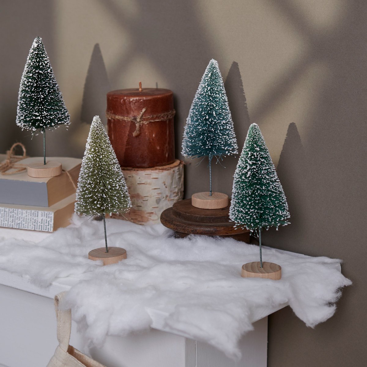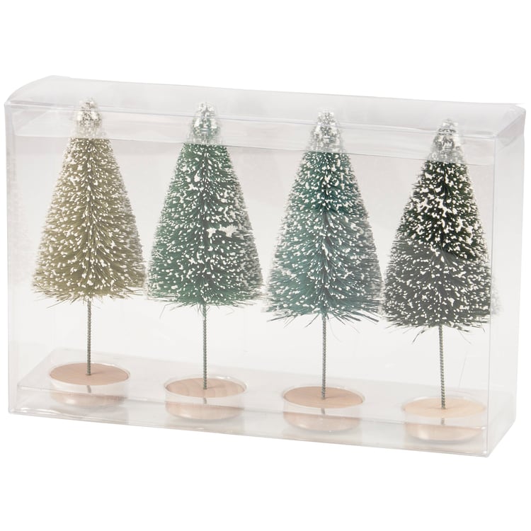 A set of four bottle brush trees from our Christmas Collection displaying various natural green colors with mica details for a snowy appearance. Our Green Winter bottle brush trees are attached to round natural wood bases to free-stand on flat surface. Seasonal bottle brush tree set is packaged in a PVC box to easily display on shelves. A set of seasonal home accents with a variety of display options.