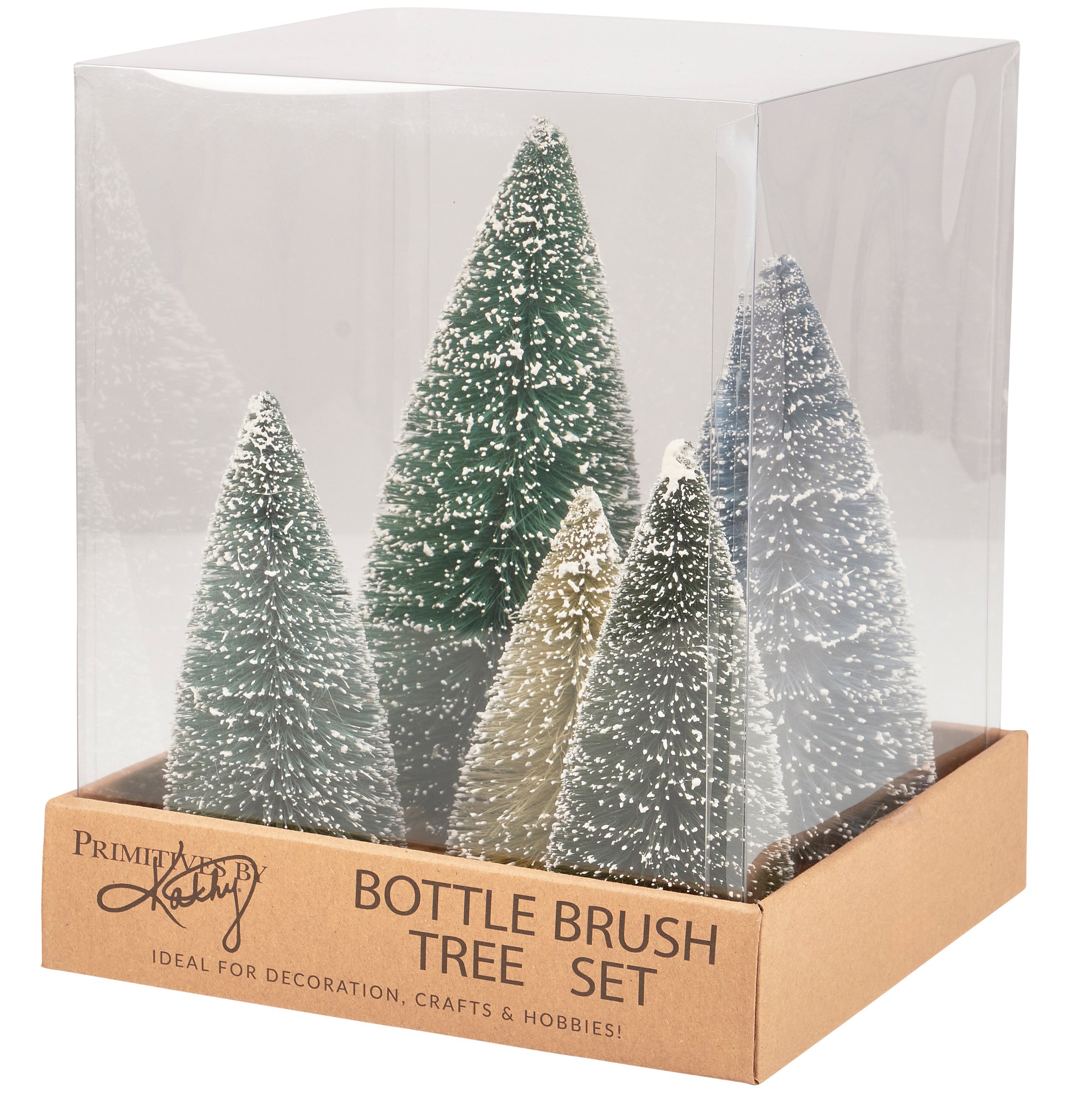A set of five bottle brush trees in different sizes from our Christmas Collection displaying various winter colors with mica details for a snowy appearance. Our Snowy Green bottle brush trees are attached to round natural wood bases to free-stand on flat surface. Seasonal bottle brush tree set is packaged in a carboard tray with PVC lid to easily display on shelves. A set of seasonal home accents with a variety of display options.
