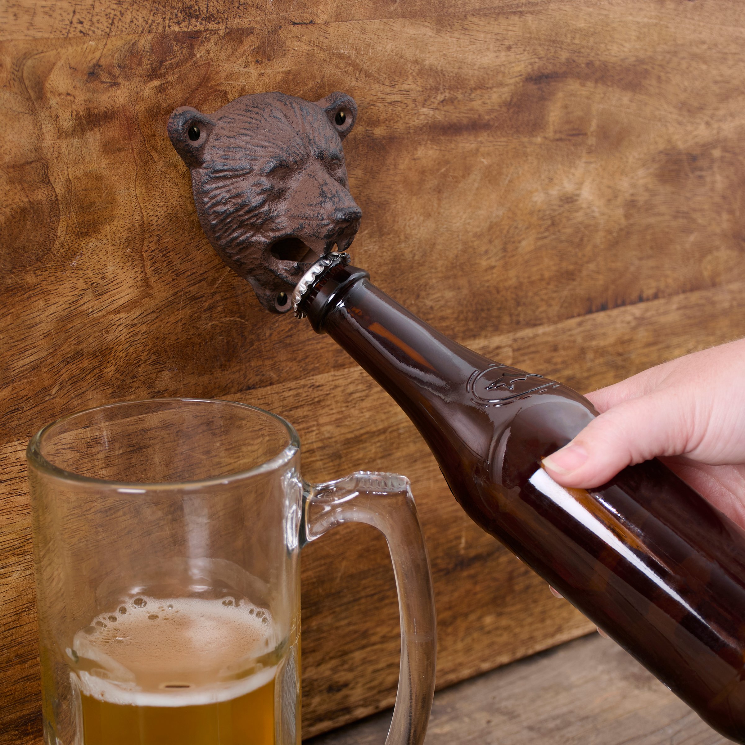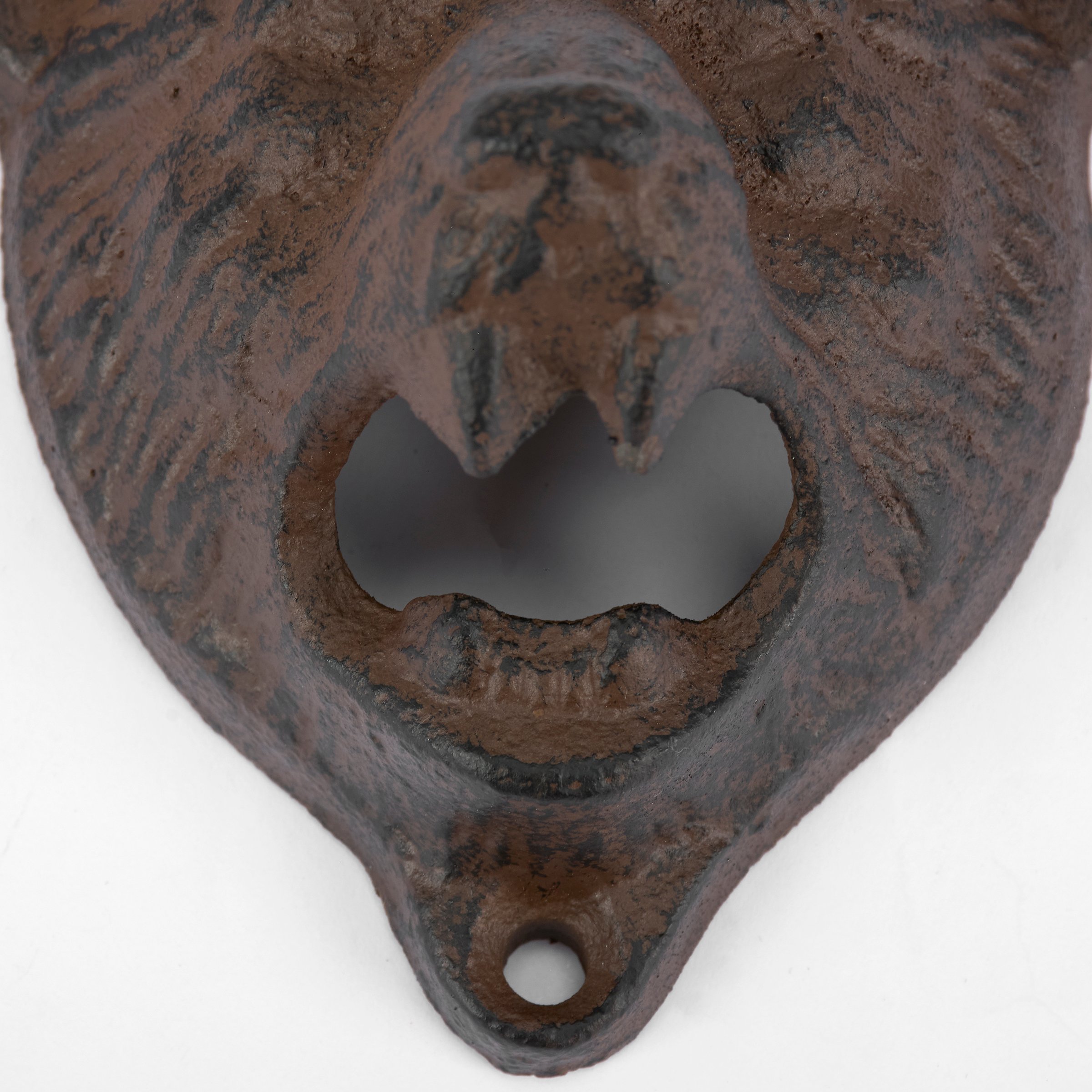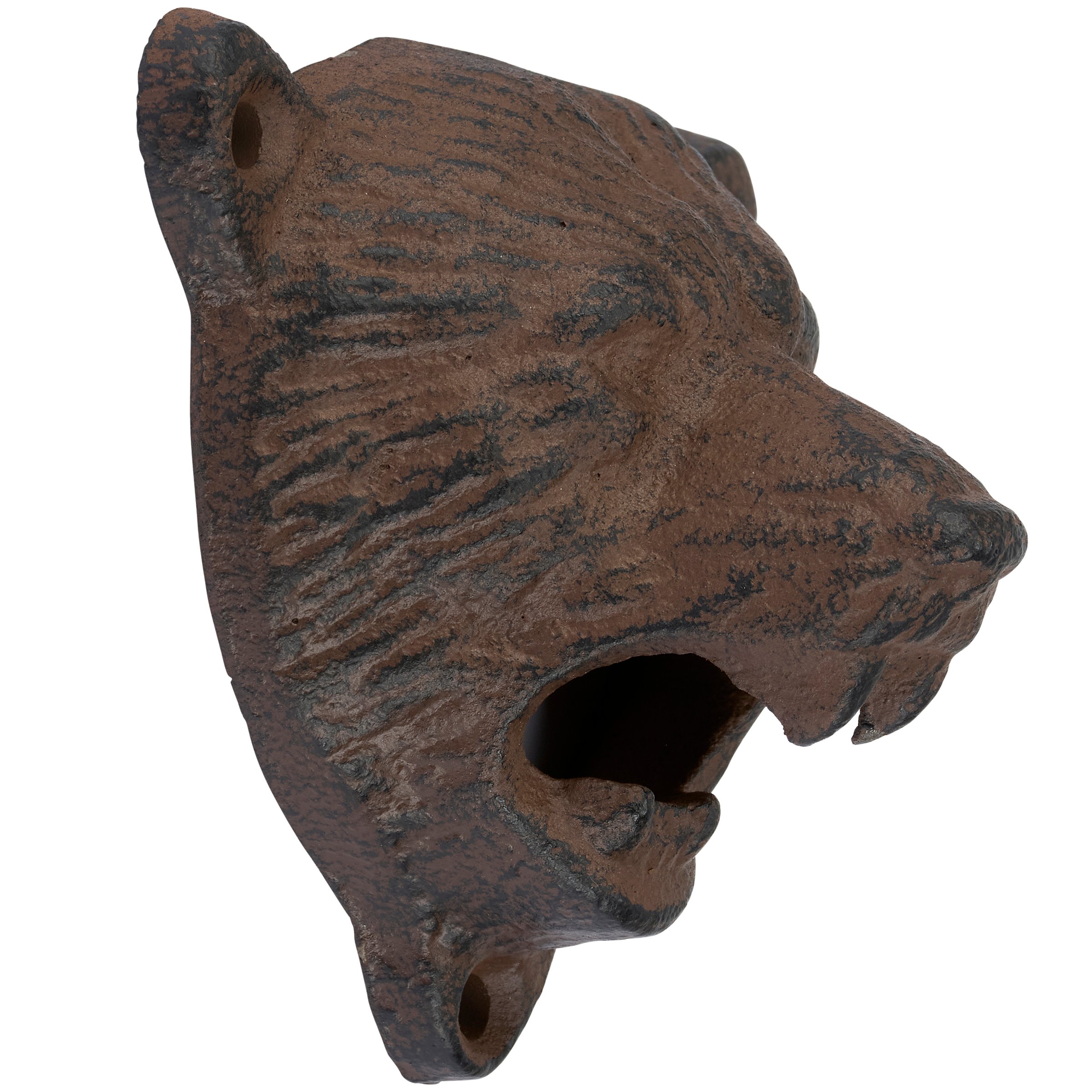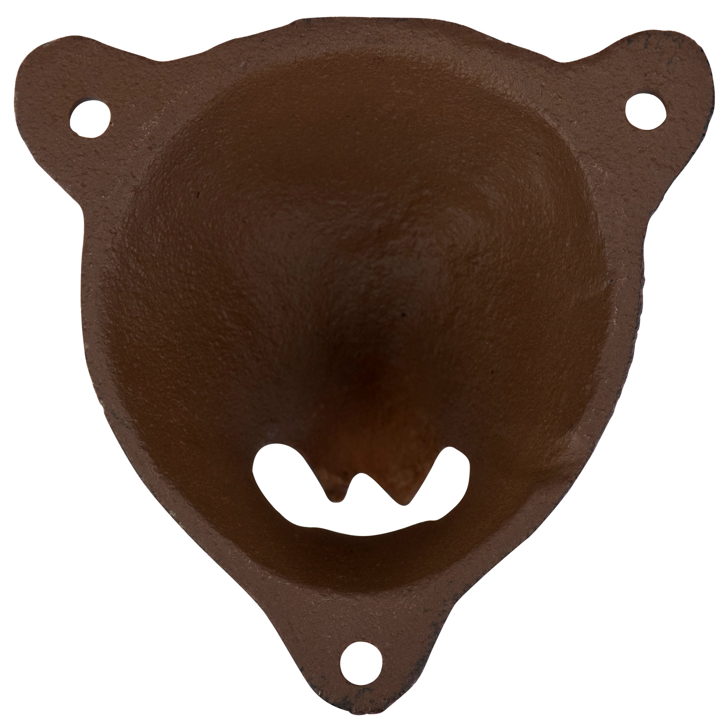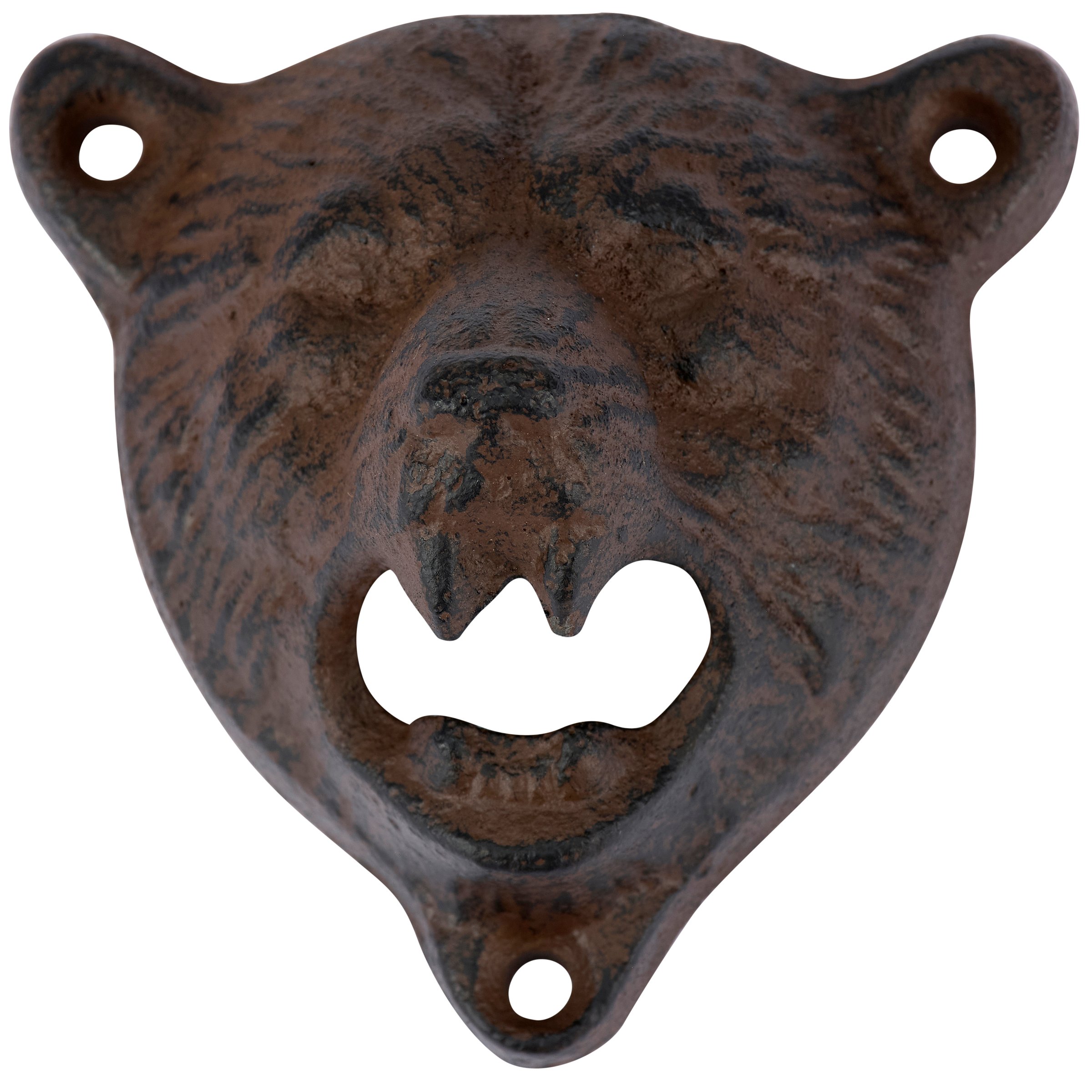 A metal bottle opener from our Lake & Cabin Collection displaying a rustic design inspired by cabin décor. This sturdy metal bottle opener features a sculpted bear head design with antique finish and open mouth to remove bottle caps. Our Bear bottle opener is easy to hang for display and use via predrilled holes on the top and bottom. A rustic home accent that adds functional style to any indoor or outdoor space.