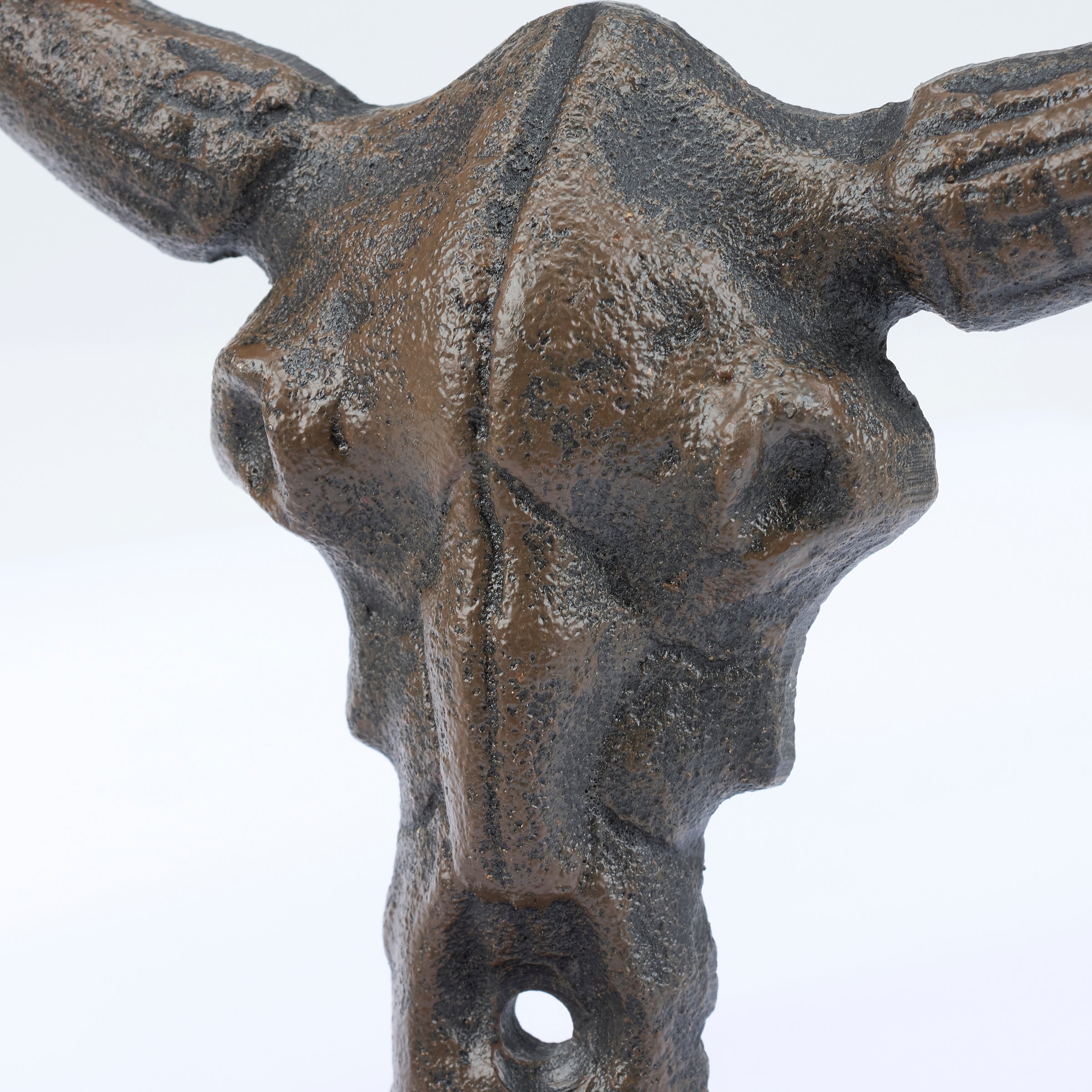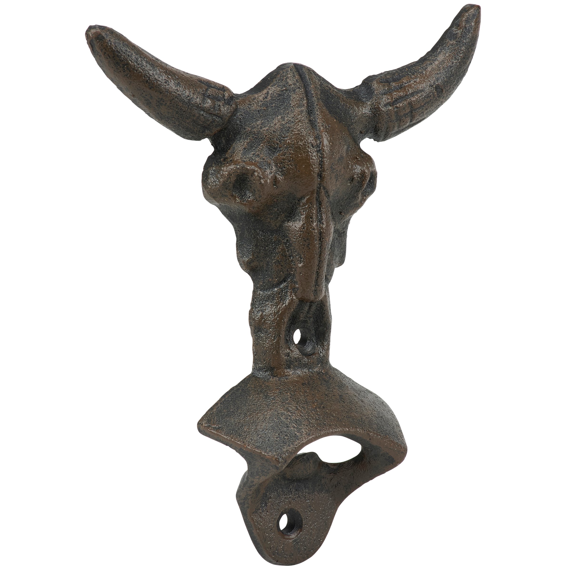 A metal bottle opener from our Western Collection displaying a rustic design inspired by western home décor. This sturdy metal bottle opener features a sculpted bull skull design with antique finish and space underneath to remove bottle caps. Our Bull Skull bottle opener is easy to hang for display and use via predrilled holes. A western home accent that adds functional style to any indoor or outdoor space.