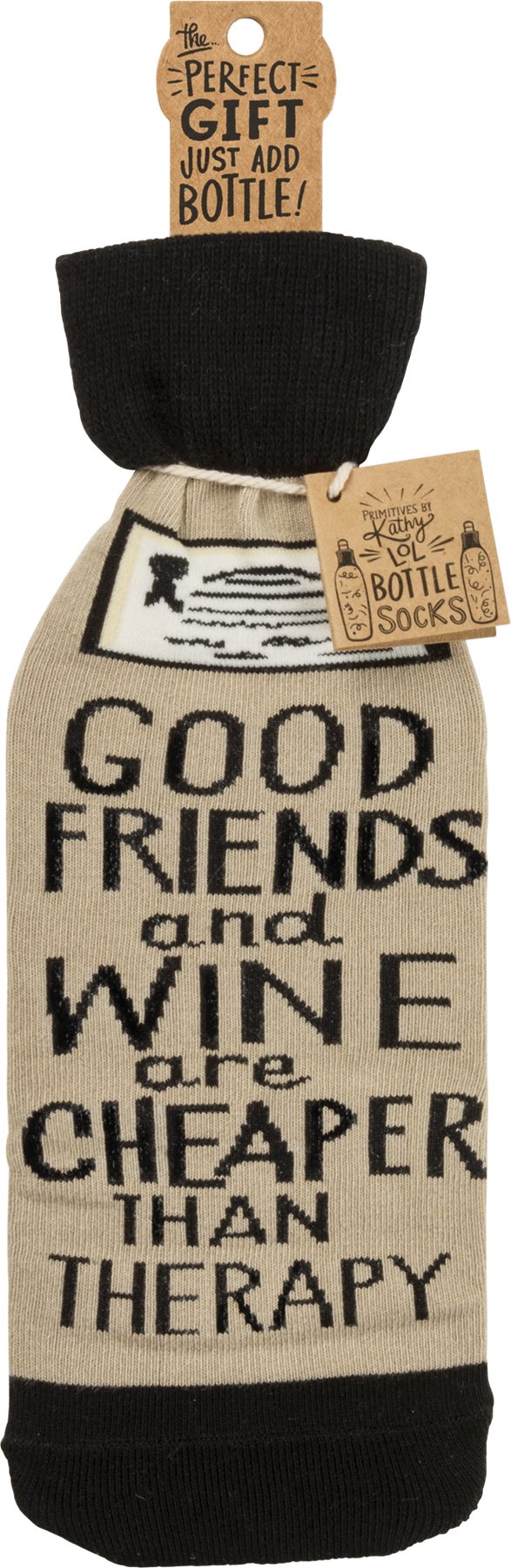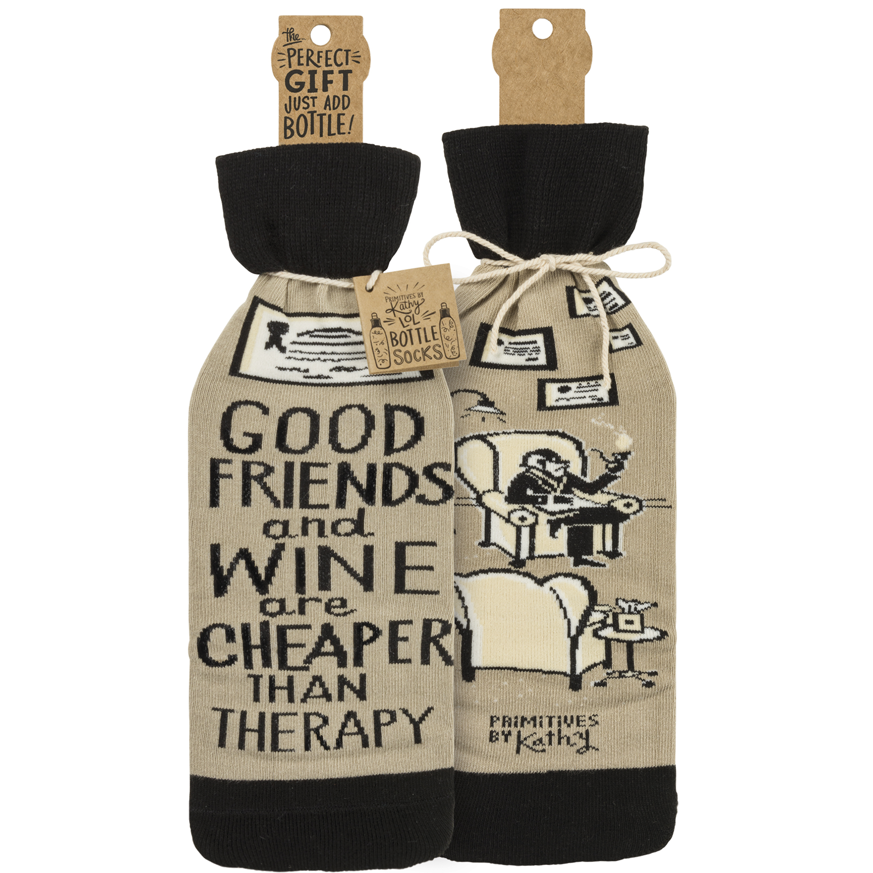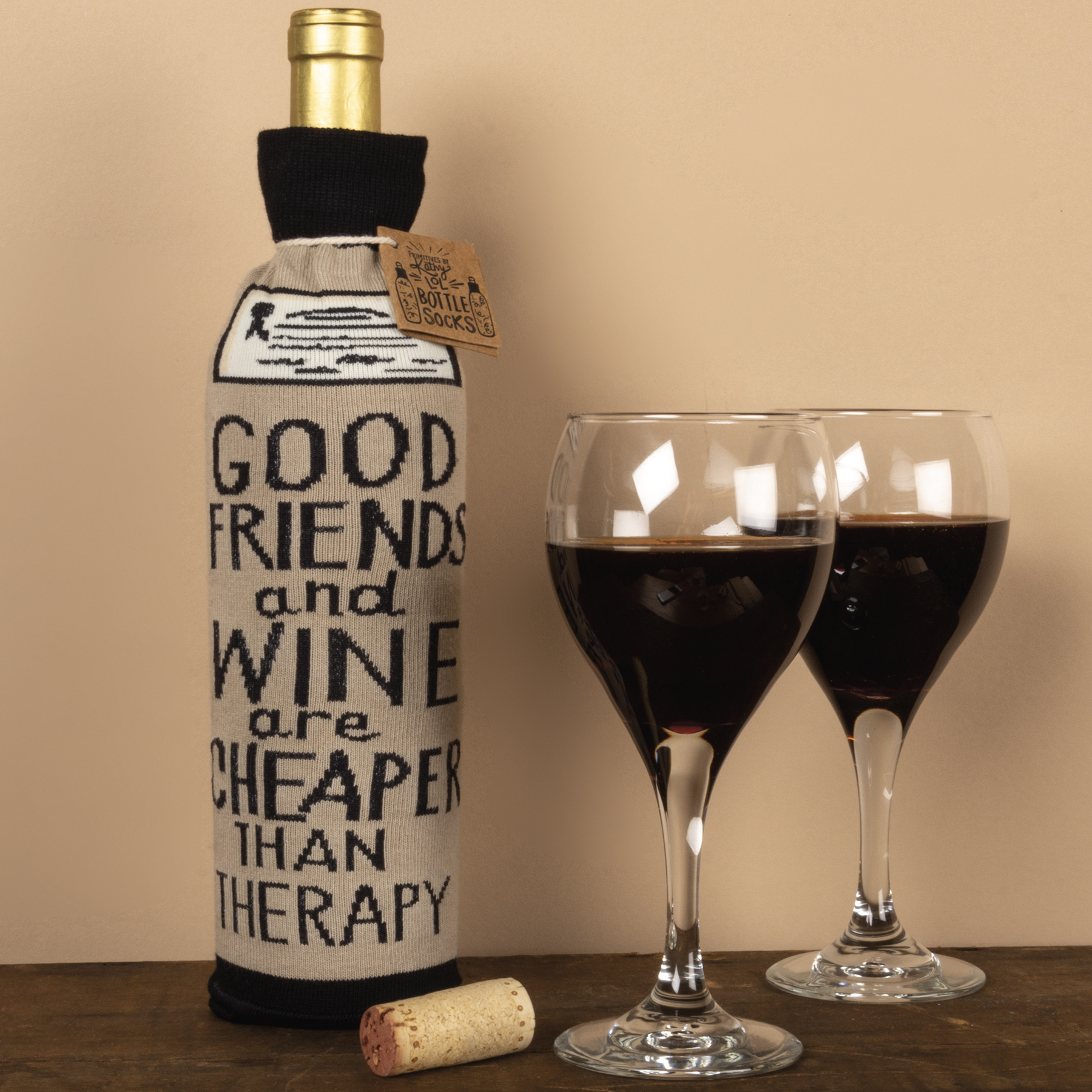 A creative alternative for a traditional gift bag, a washable and re-useable "Good Friends And Wine Are Cheaper Than Therapy" knit bottle sock with character in living room designs throughout.