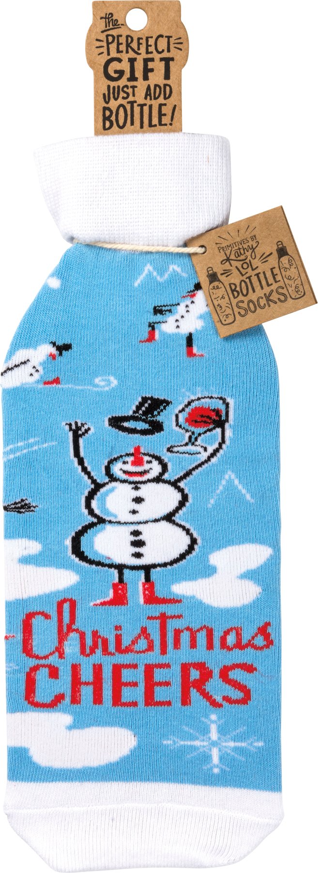 A creative alternative for a traditional gift bag, a washable and re-useable "Christmas Cheers" knit bottle sock with drinking and playing snowmen designs.
