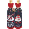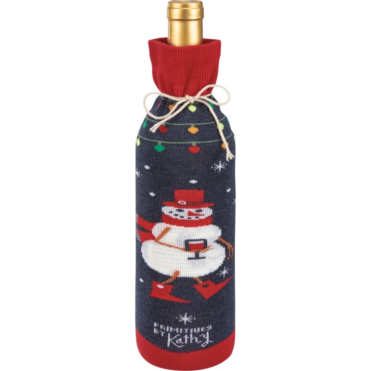 A creative alternative for a traditional gift bag, this washable and re-useable knit bottle sock displays a humorous "Jingle Juice Time" sentiment with designs of snowmen drinking. Packaging includes a kraft paper hangtag that can be used as a gift tag. Our Jingle Juice Time bottle sock is wrapped around a cardboard insert with a hole to easily display on rack. Sock is made with a blend of cotton, nylon, and spandex to fit bottles around 750 mL to 1.5 liters. Pairs well with other giftable items from our Christmas Collection. Bottle sock can also be displayed on an empty bottle as a decorative accent.