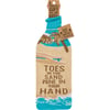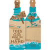 A creative alternative to a traditional gift bag, this washable and reusable knit bottle sock features a "Toes In The Sand Wine In Your Hand" sentiment with beach designs. Hangtag doubles as a gift tag.