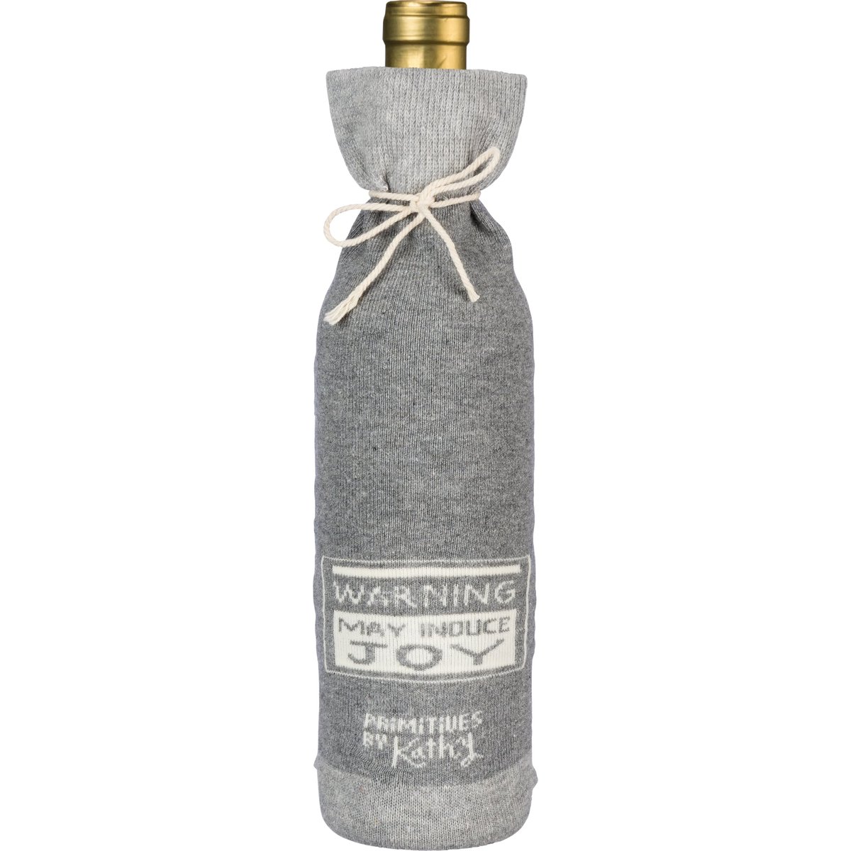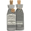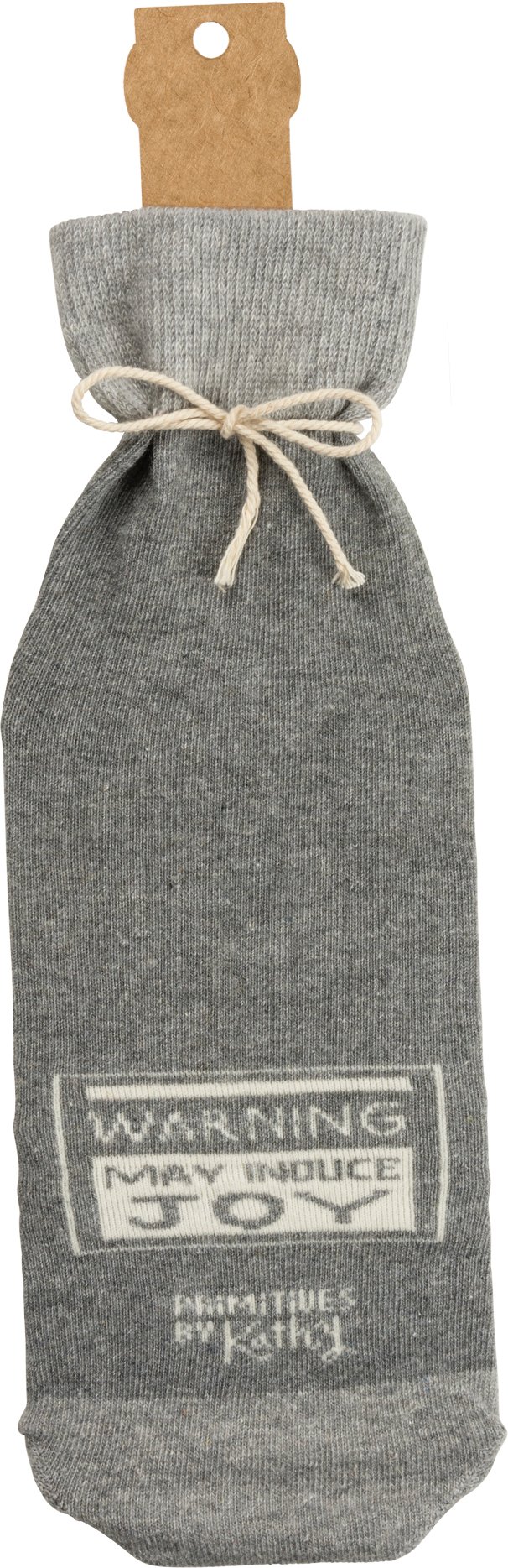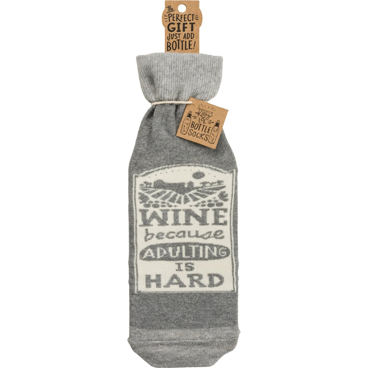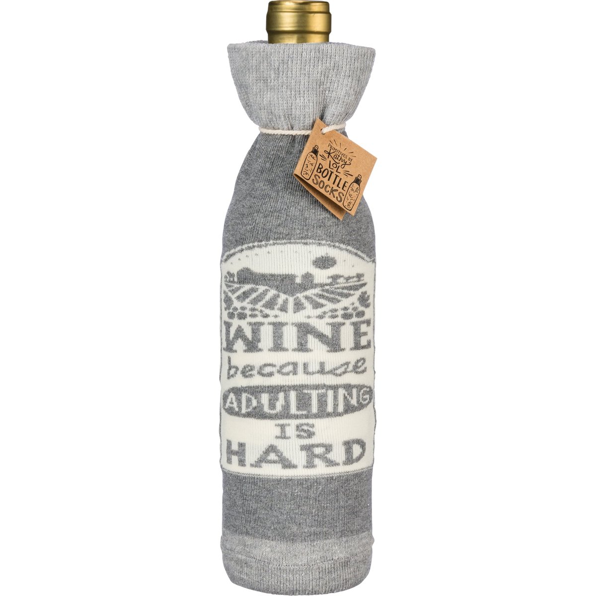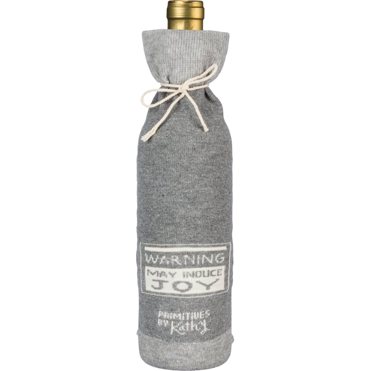 A creative alternative for a traditional gift bag, a washable and re-useable "Wine - Because Adulting Is Hard" knit bottle sock with reverse "Warning - May Induce Joy" sentiment.